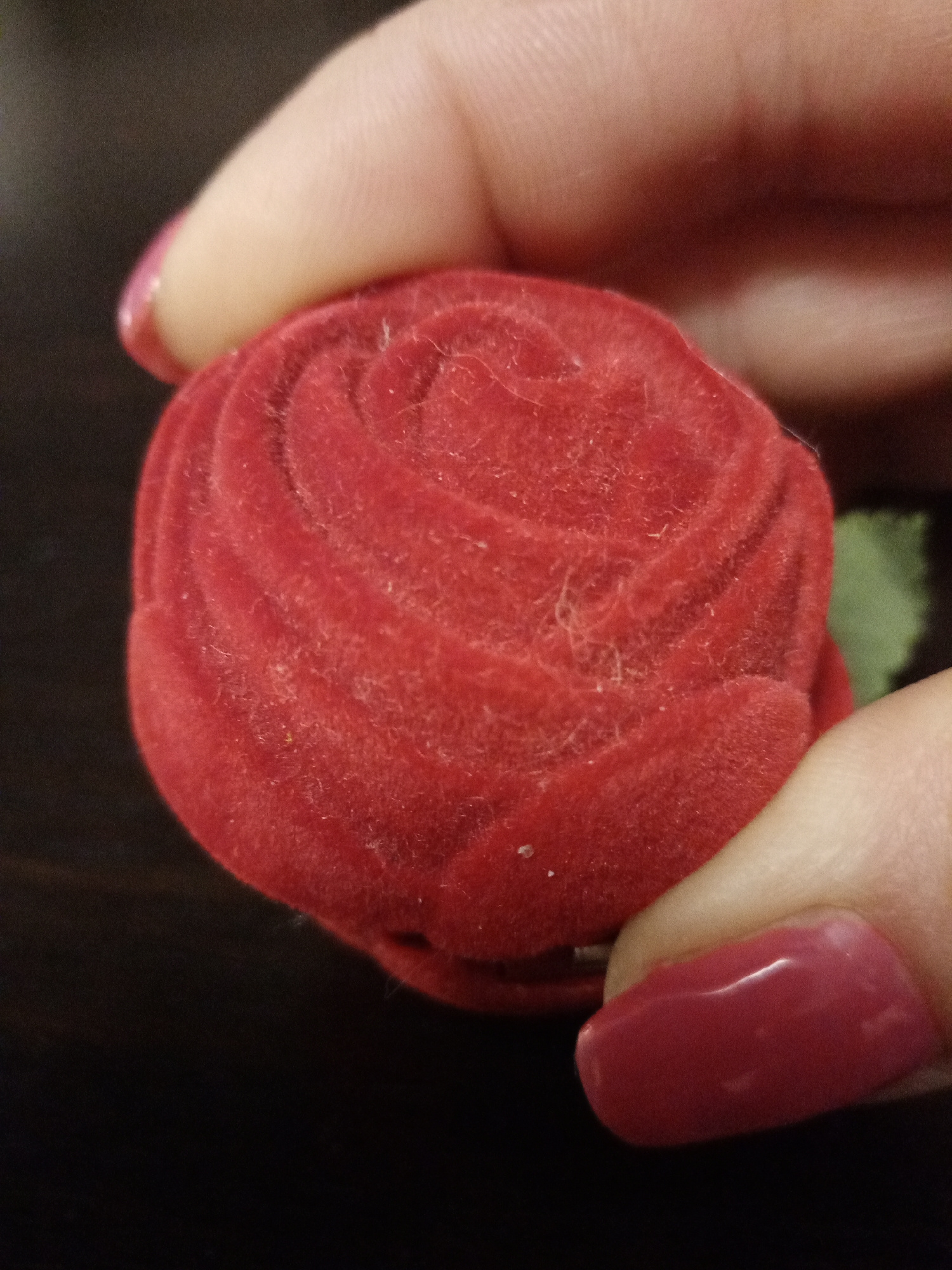 A close-up shot depicts a person holding a red, rose-shaped velvet ring box between their thumb and index finger. The box is the focal point, showcasing the soft texture and swirling pattern resemblin…read more