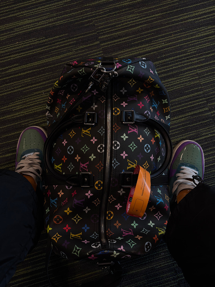 A top-down view captures the lower extremities of an individual seated on a dark green carpet with subtle diagonal striping, likely within Istanbul Airport (IST) in Arnavutköy, Turkey. The person wear…read more