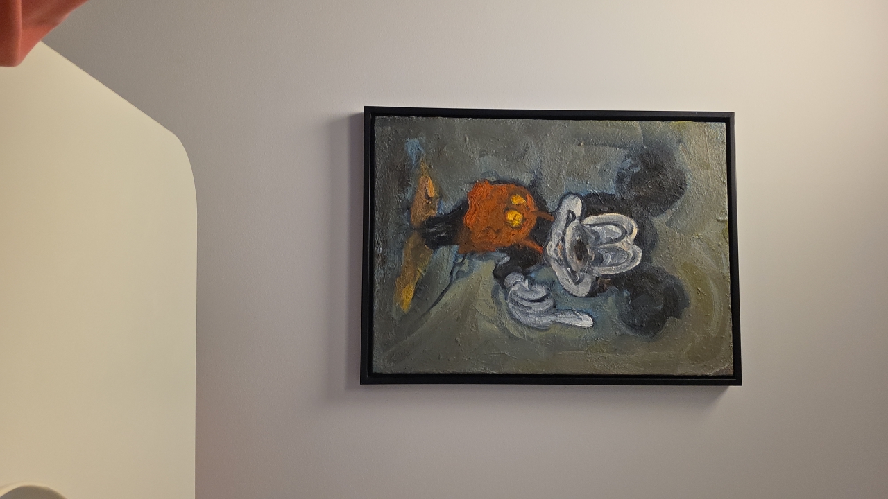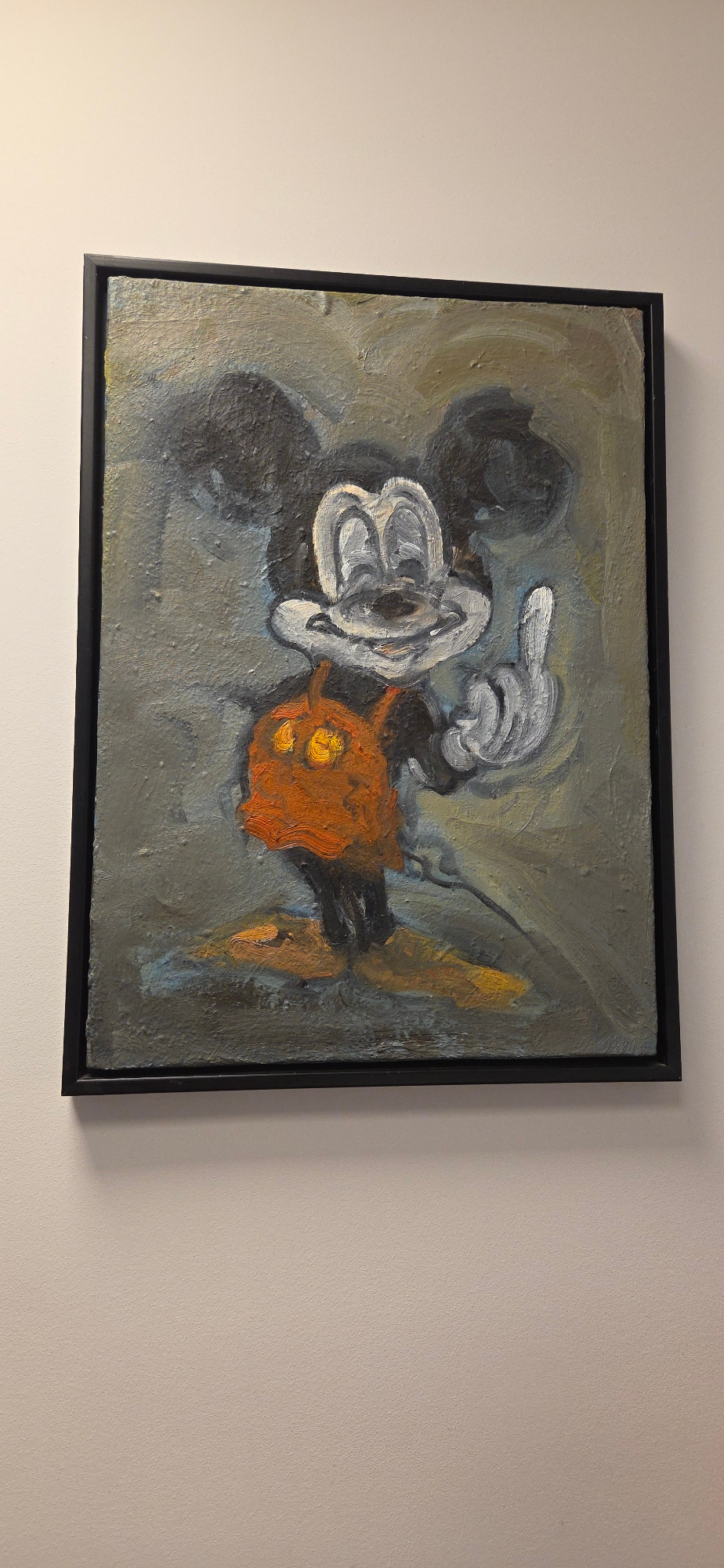 A painting of Mickey Mouse in a black frame hangs on a pale wall. The painting is done in a rough, expressive style with visible brushstrokes. The colors are muted, with grays, blacks, and oranges dom…read more