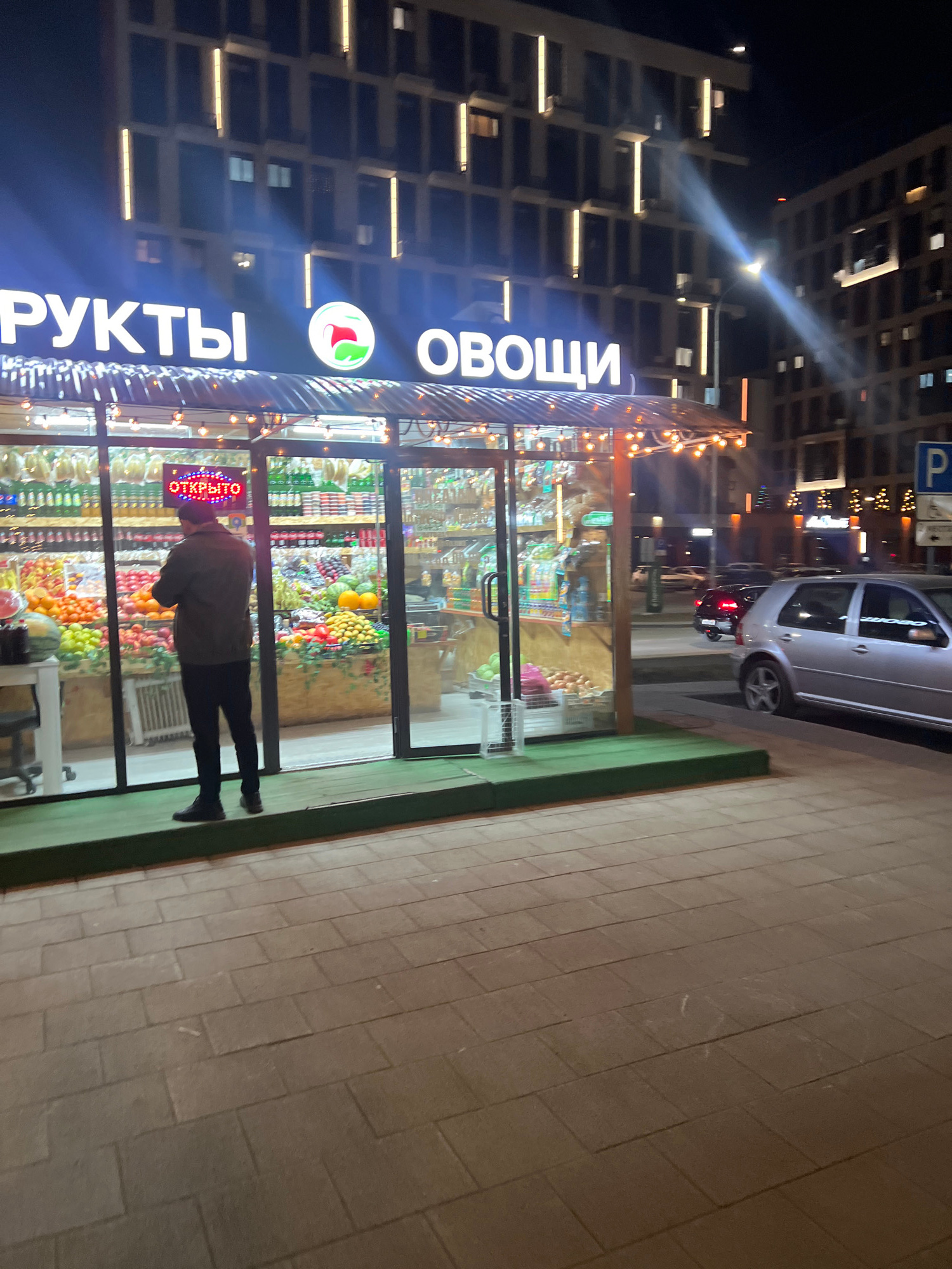 The image shows a street scene in Tyumen, Russia at night. A fruit and vegetable shop ("ФРУКТЫ ОВОЩИ") is visible, illuminated by bright lights and a string of decorative bulbs. A customer is inside t…read more
