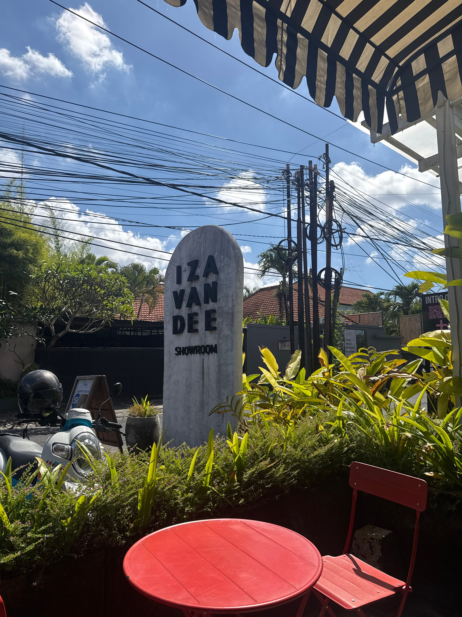 The image depicts an outdoor street scene in North Kuta, Indonesia, bathed in bright daylight under a clear blue sky with scattered white clouds. The perspective looks upwards, highlighting a dense ne…read more