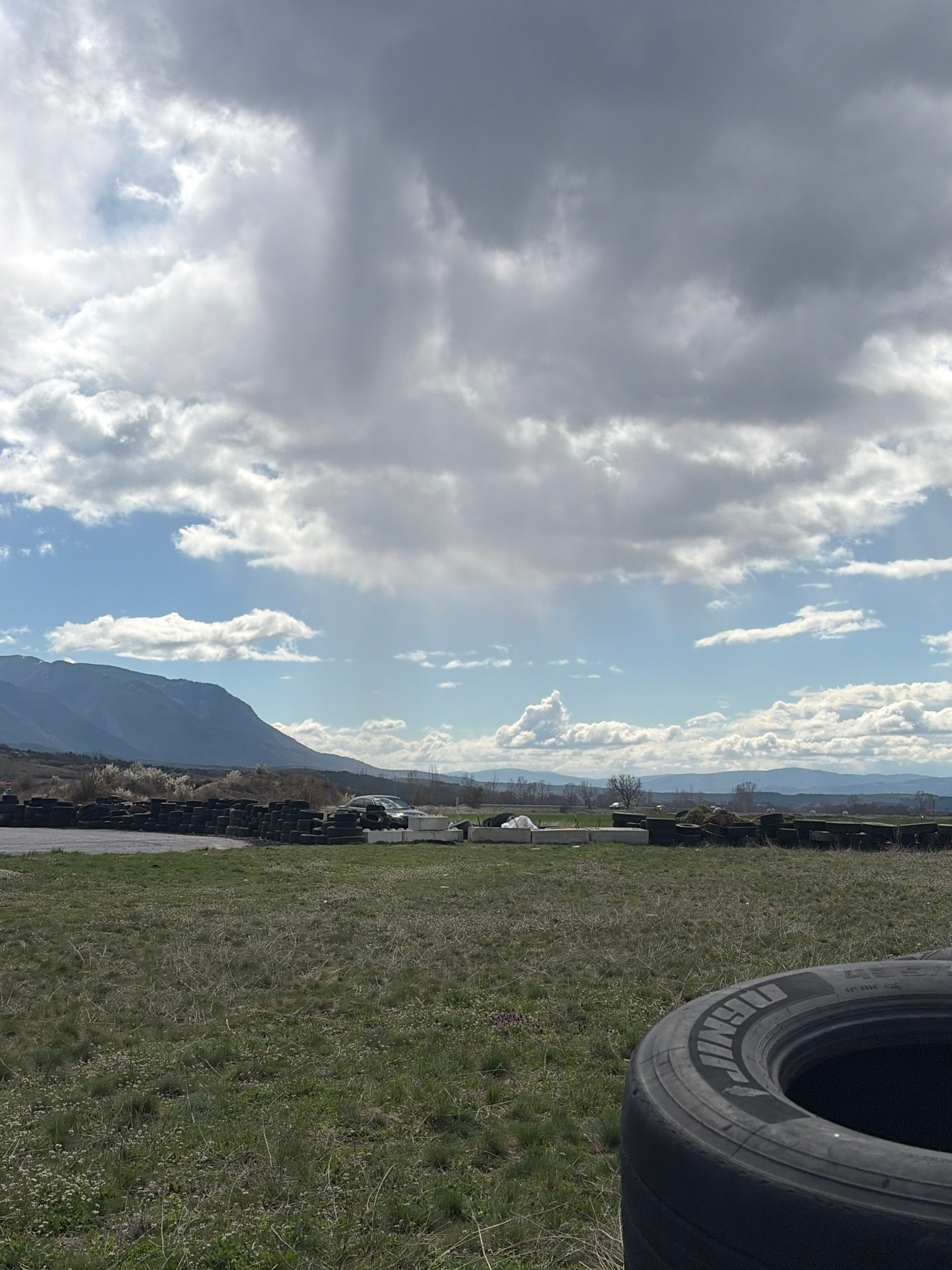 The image shows an outdoor scene near Kraynitsi, Bulgaria. The foreground is dominated by green grass. A stack of tires is present on the right. In the background, there is a mountain range beneath a…read more