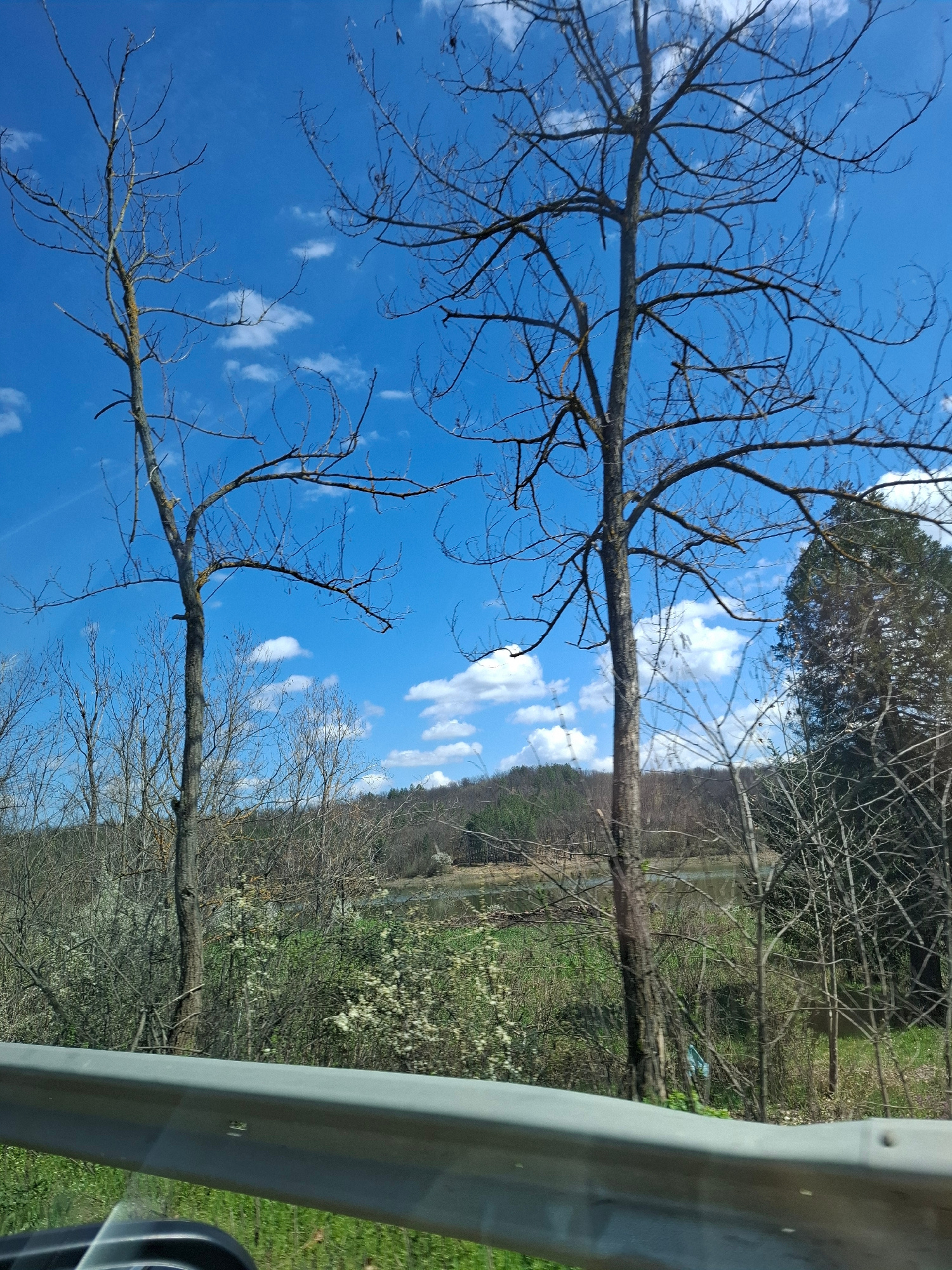 The image shows a roadside view, likely taken from inside a vehicle, as indicated by the presence of a guardrail and the vehicle's interior visible on the right side of the frame. The landscape consis…read more