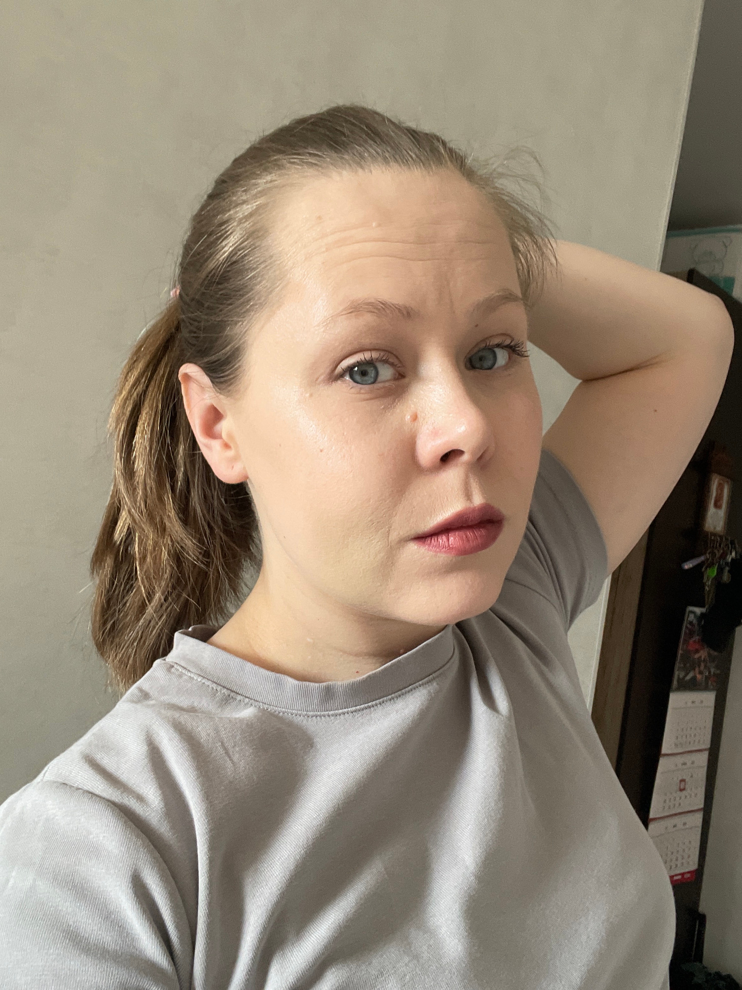 This self-portrait captures an individual, likely female, with fair skin, blue-grey eyes, and light brown hair tied back, gazing directly at the camera with a neutral expression. She is wearing a ligh…read more