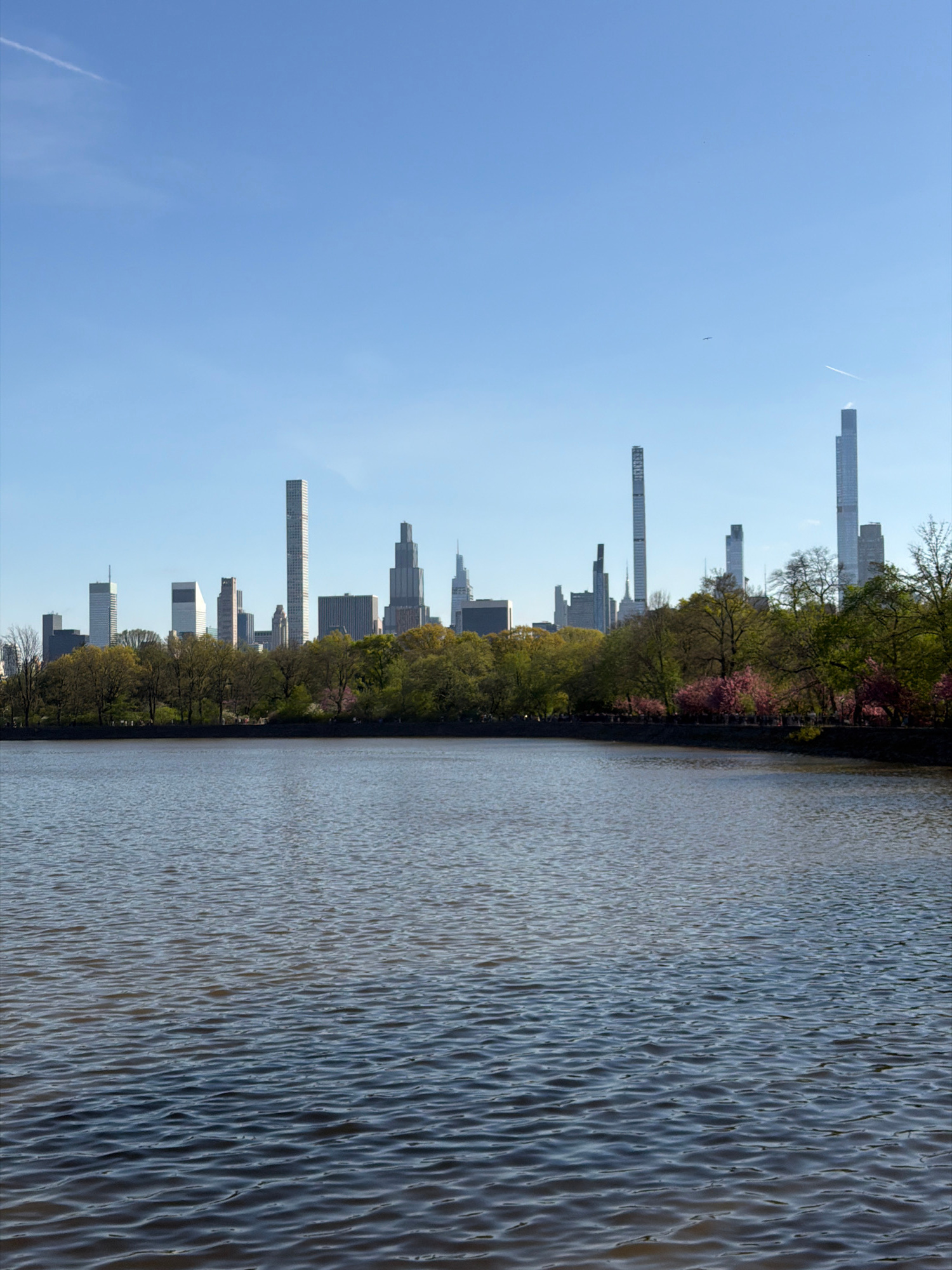 The image captures a cityscape view alongside a body of water, likely a reservoir or pond in Central Park, New York City. The perspective is oriented vertically, with the sky dominating the left side…read more