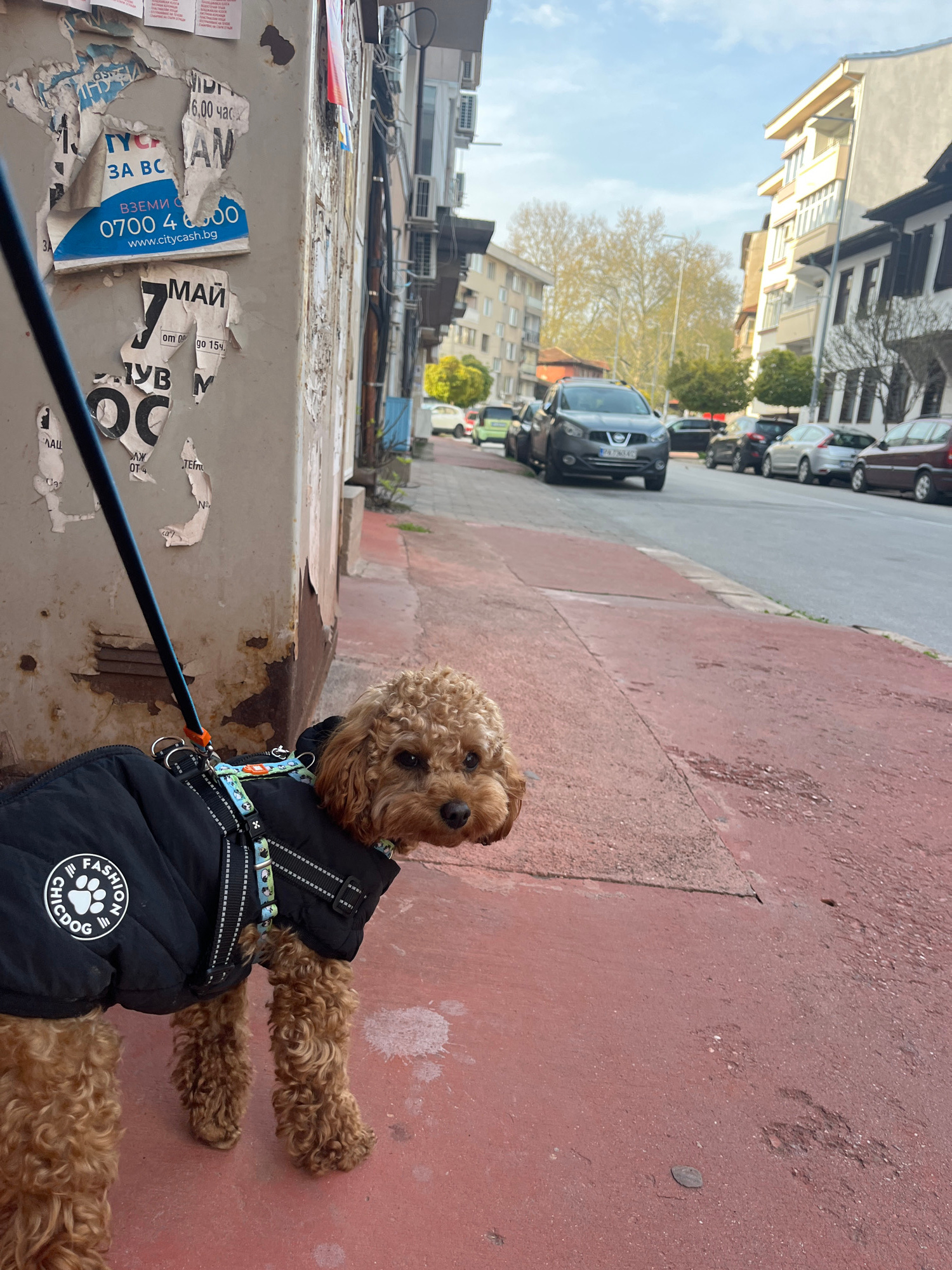 A small, light brown, curly-haired dog, likely a poodle or poodle mix, is captured mid-walk on a reddish-brown sidewalk in an urban setting. The dog is wearing a black quilted jacket adorned with a wh…read more