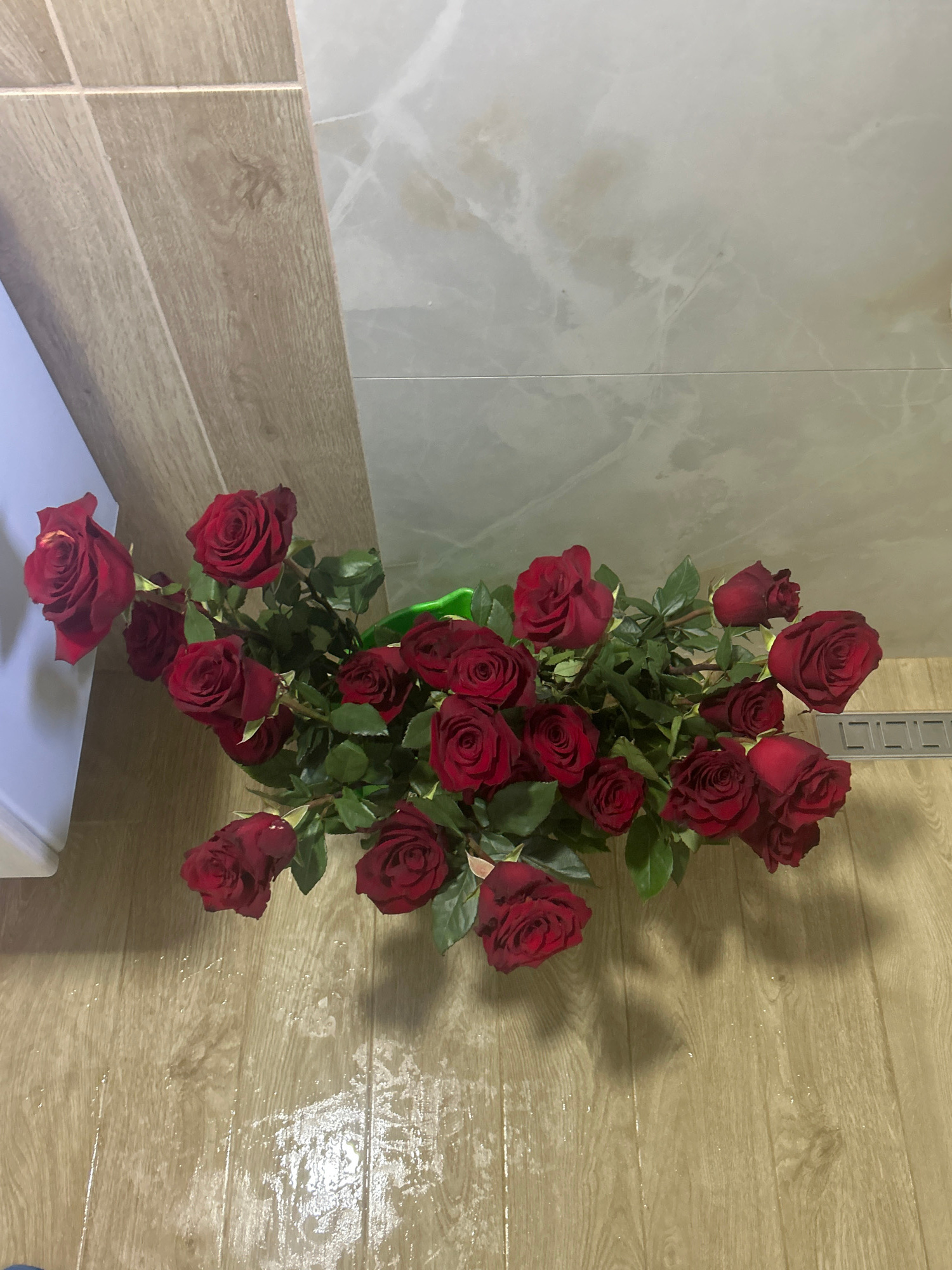 A vertical, eye-level shot shows a bouquet of red roses arranged in a green vase, placed on a white surface next to a wall. The wall to the left has a light gray marble-like pattern, while the wall to…read more
