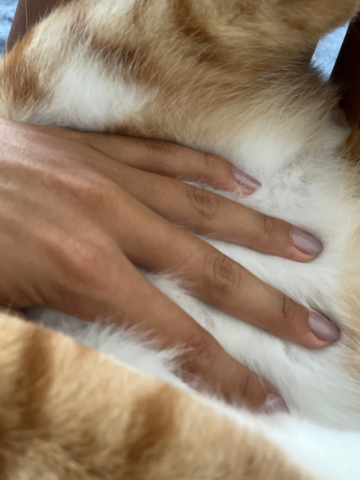 A hand with mauve nail polish rests on the orange and white fur of a cat. The location is unknown. The country is Indonesia. | Open Wire