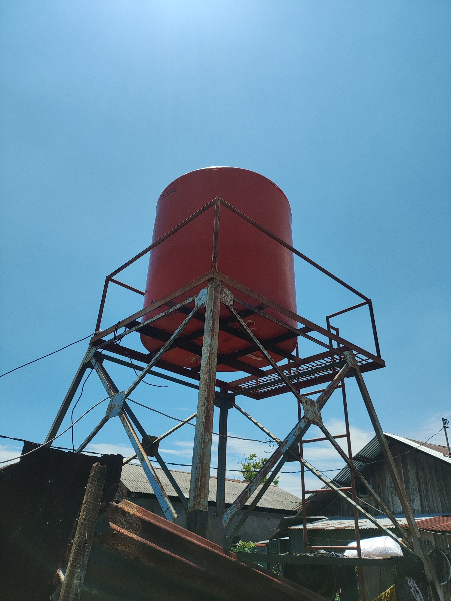 A low-angle shot captures a red water tank mounted on a steel frame structure, likely for domestic water storage in Lhokseumawe, Indonesia. The tank is cylindrical, with a visible label "1050L." The s…read more