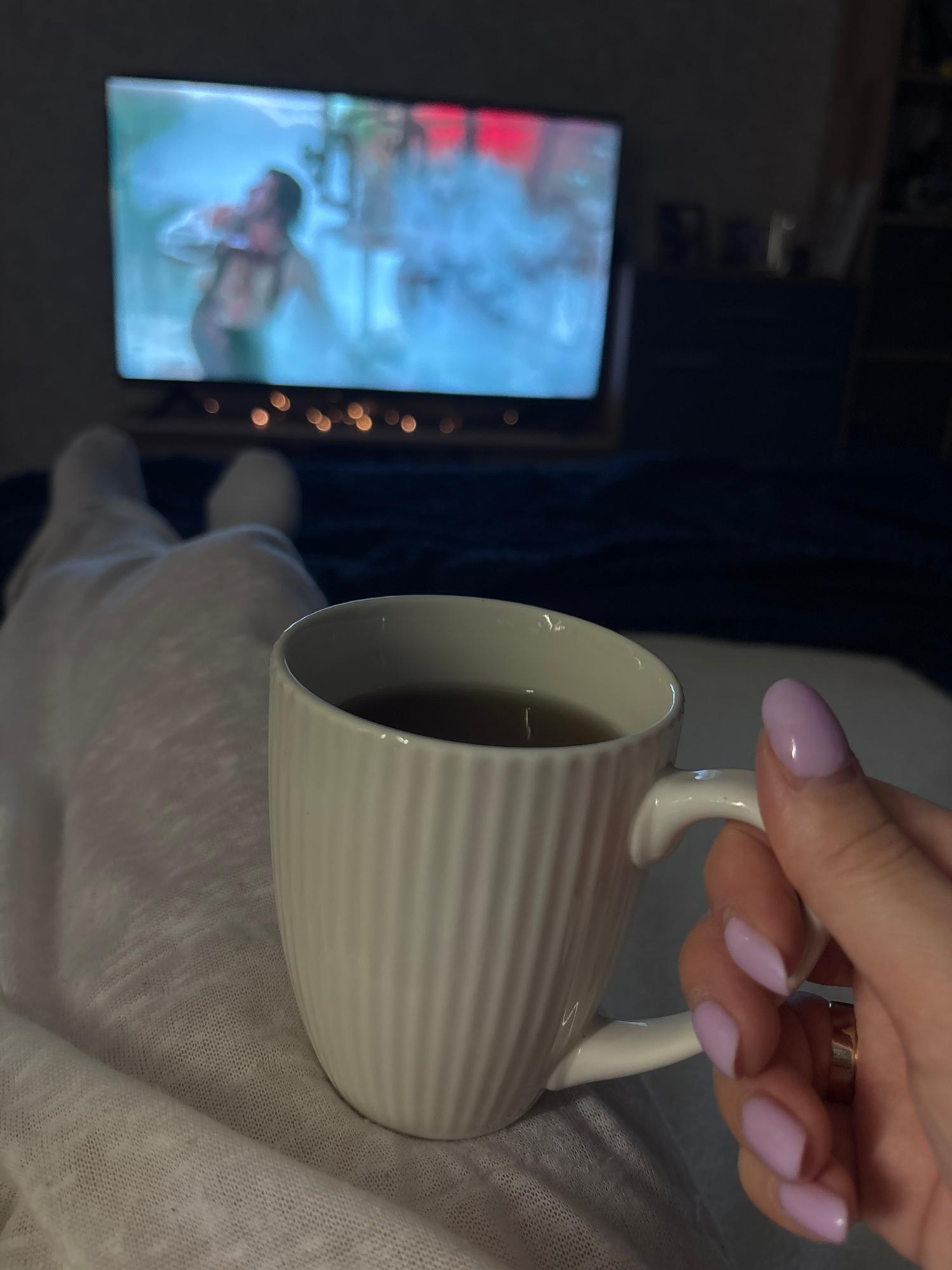 A hand with lavender-colored fingernails holds a white, ribbed mug filled with a dark liquid, possibly coffee or tea. The mug rests against a white, loosely woven fabric, likely a blanket or a piece o…read more