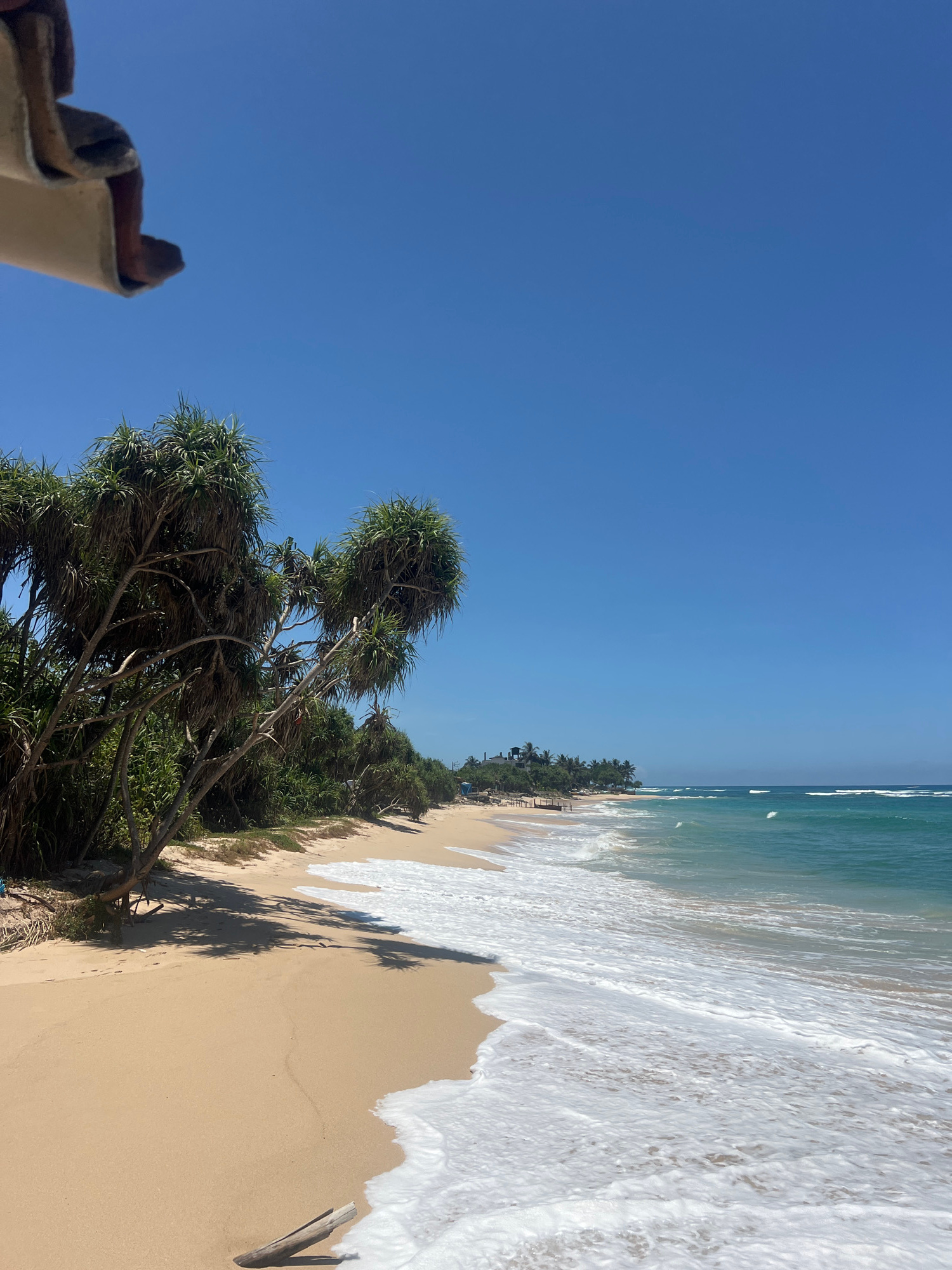 This image captures a bright, sunny coastal landscape, characteristic of a tropical beach like Kathaluwa, Sri Lanka. The scene is dominated by a vast, clear blue sky. Below, a line of lush green coast…read more