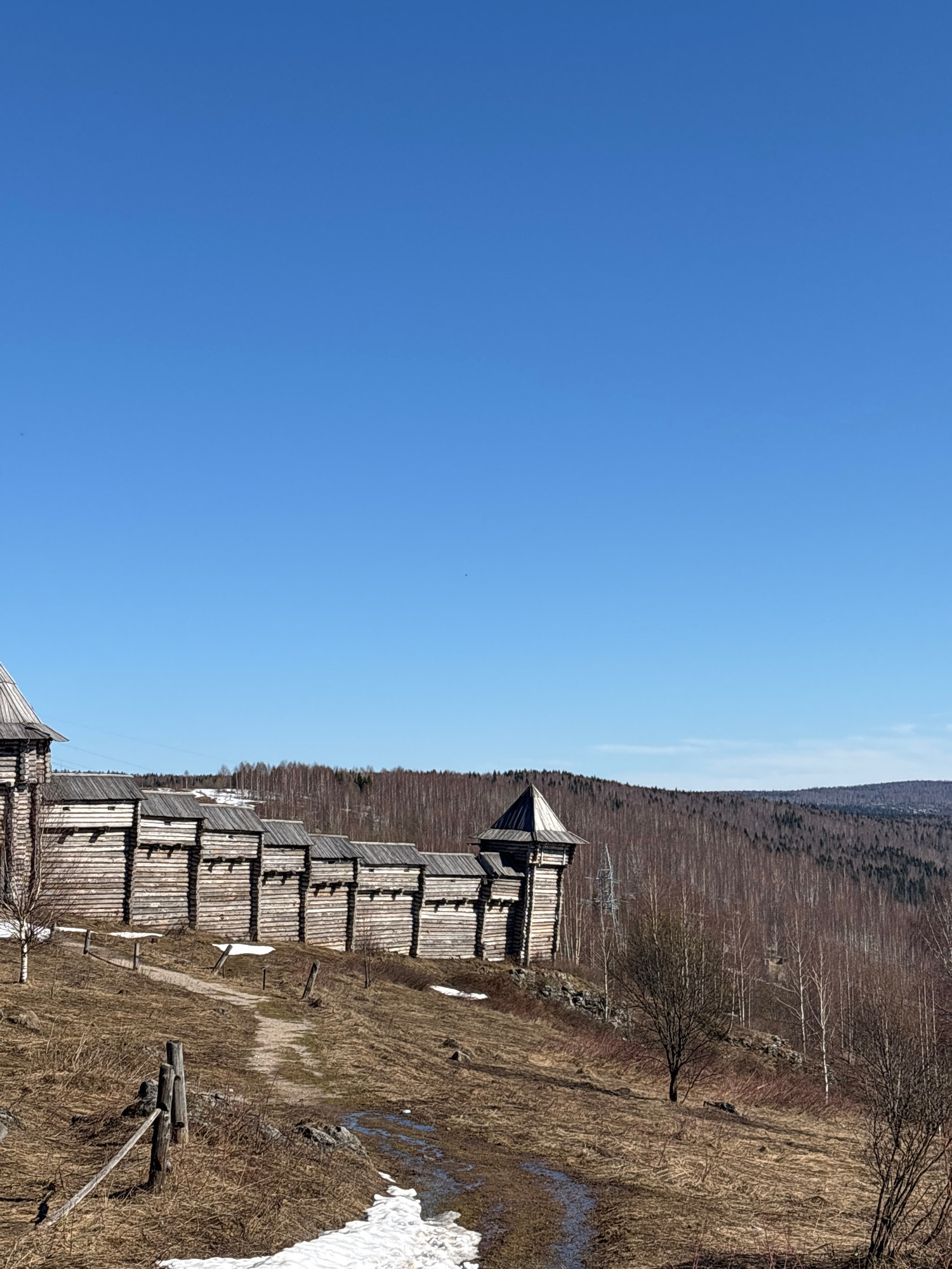 The image depicts a wooden structure, possibly a fortified wall or tower, located near the city of Gubakha, Russia. The structure is constructed of logs and consists of multiple tiers, with a prominen…read more