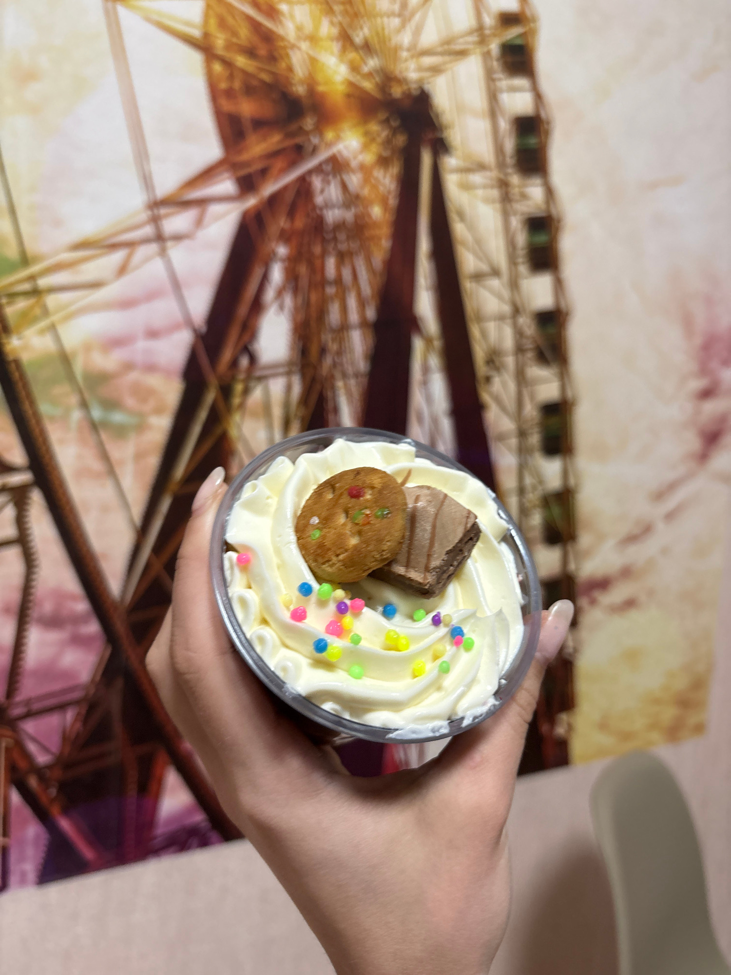 A person is holding a clear plastic cup filled with white, swirled whipped cream, topped with a piece of chocolate and a small cookie with sprinkles, and garnished with colorful sprinkles. The backgro…read more