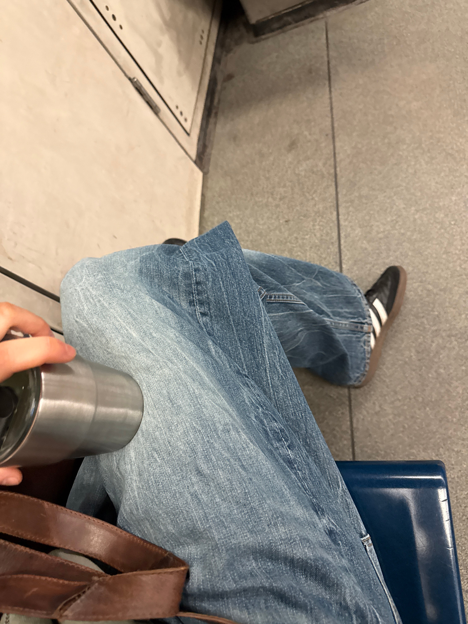 A low-angle, close-up shot captures a person's lower body and legs seated in an indoor public space, identified as Montreal, Canada. The individual is wearing light blue, faded denim jeans. Their feet…read more