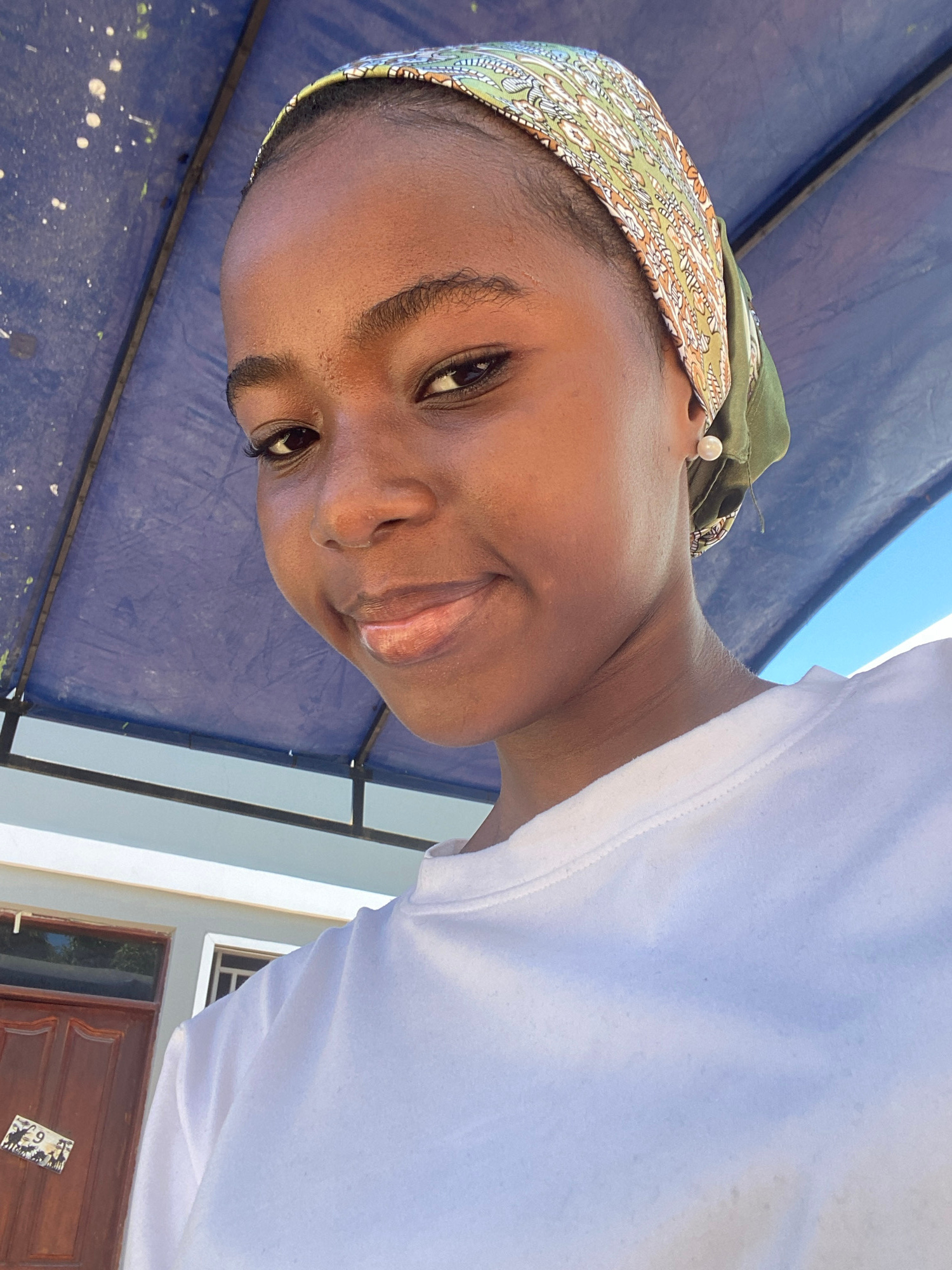 A young woman with dark skin and a headscarf stands outdoors. She is facing the camera with a slight smile. She is wearing a white shirt. The background shows a blue tarp, a white wall, and a brown do…read more