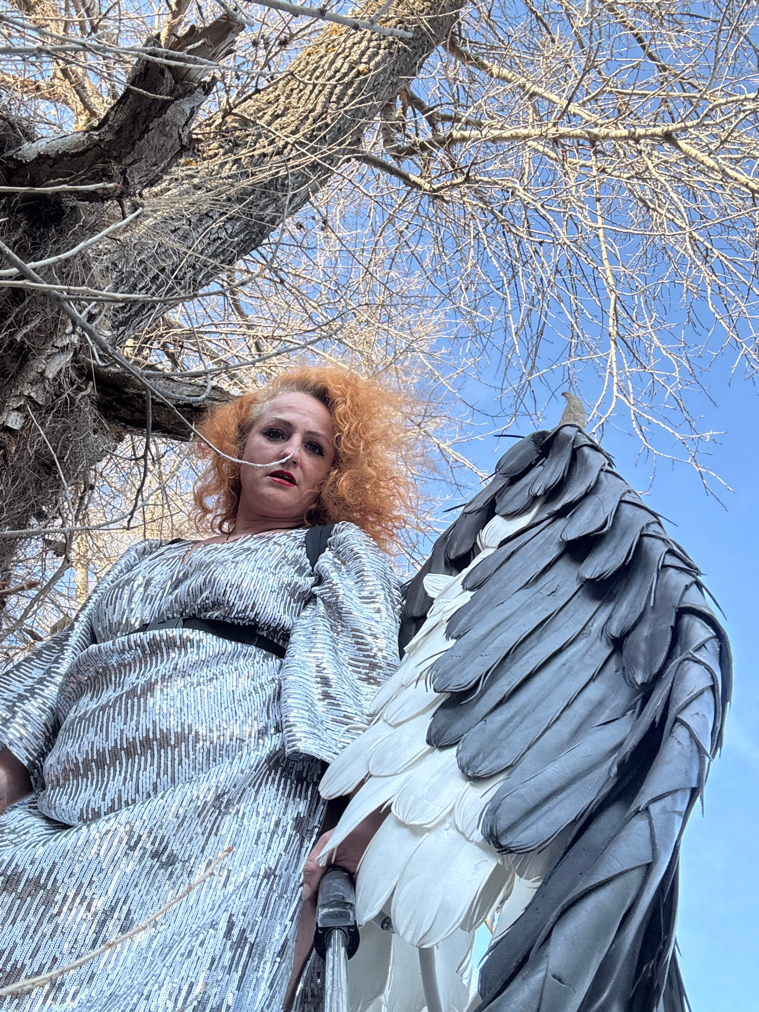 A low-angle shot shows a woman with curly red hair, wearing a silver, sequined jacket, standing next to a tree with bare branches against a light blue sky. To her right, there's a large bird-like stru…read more