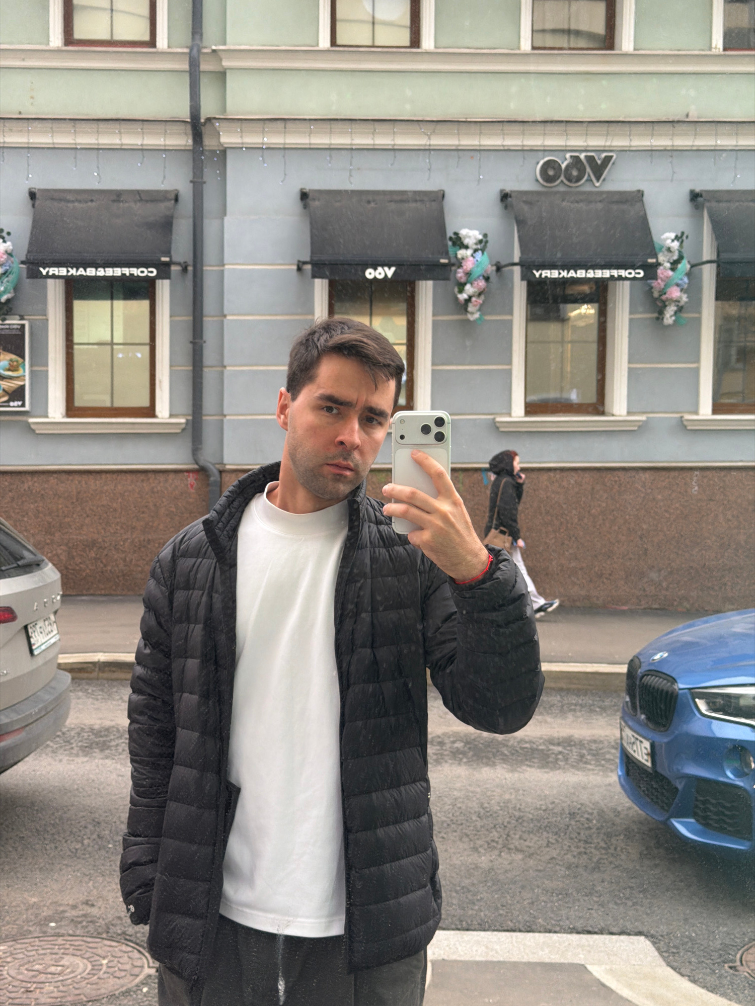 A man is captured in a selfie on an urban street in Moscow, Russia. He is positioned in the foreground, holding a light-colored smartphone with his right hand, looking directly into the camera with a…read more