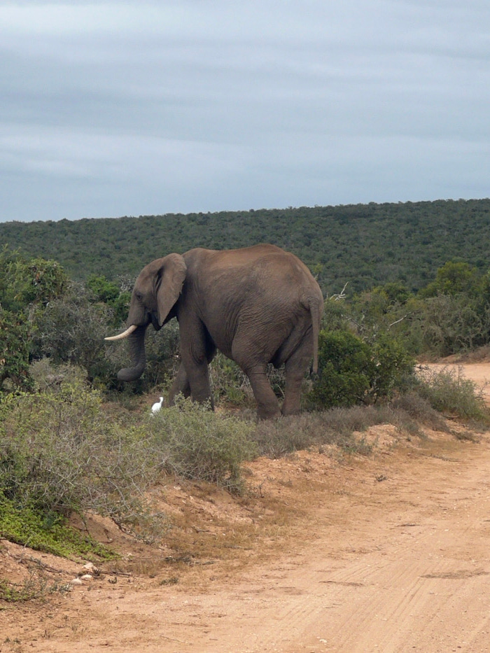 An adult African elephant is observed in profile, walking left-to-right along a raised natural embankment beside a dirt road. The elephant has visible tusks and its trunk is lowered towards the vegeta…read more