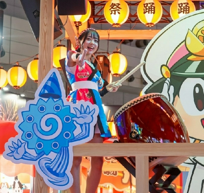 A young East Asian woman, dressed in a vibrant, multi-layered festival costume consisting of a red patterned top, a wide white obi, a blue and black kimono-style outer layer, and a red bandana, is cap…read more