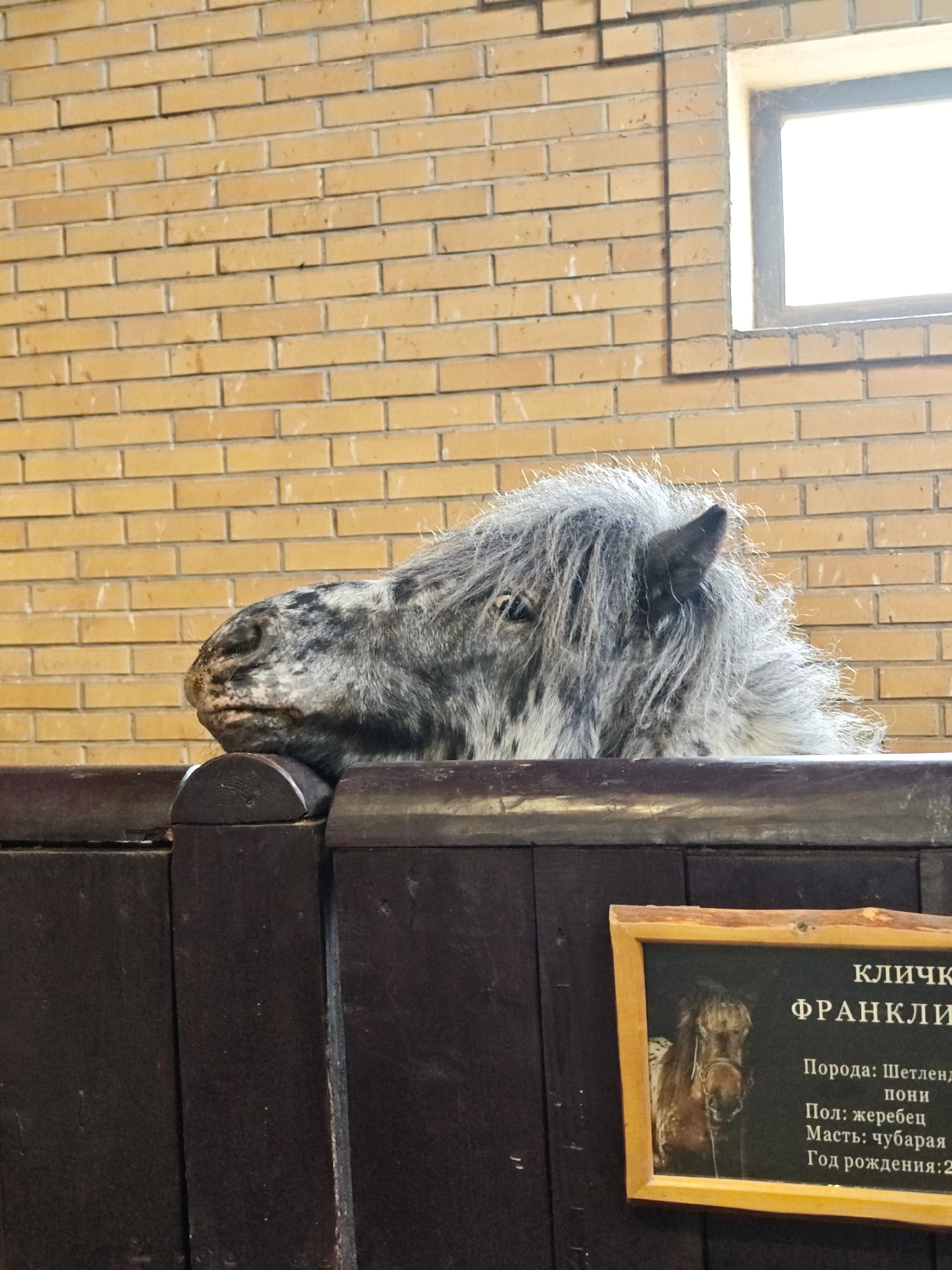 A gray pony is standing behind a dark wooden fence with a sign in front of it. The sign has a picture of the pony and some text in Russian. The text on the sign includes the pony's name, "FRANKLIN", t…read more