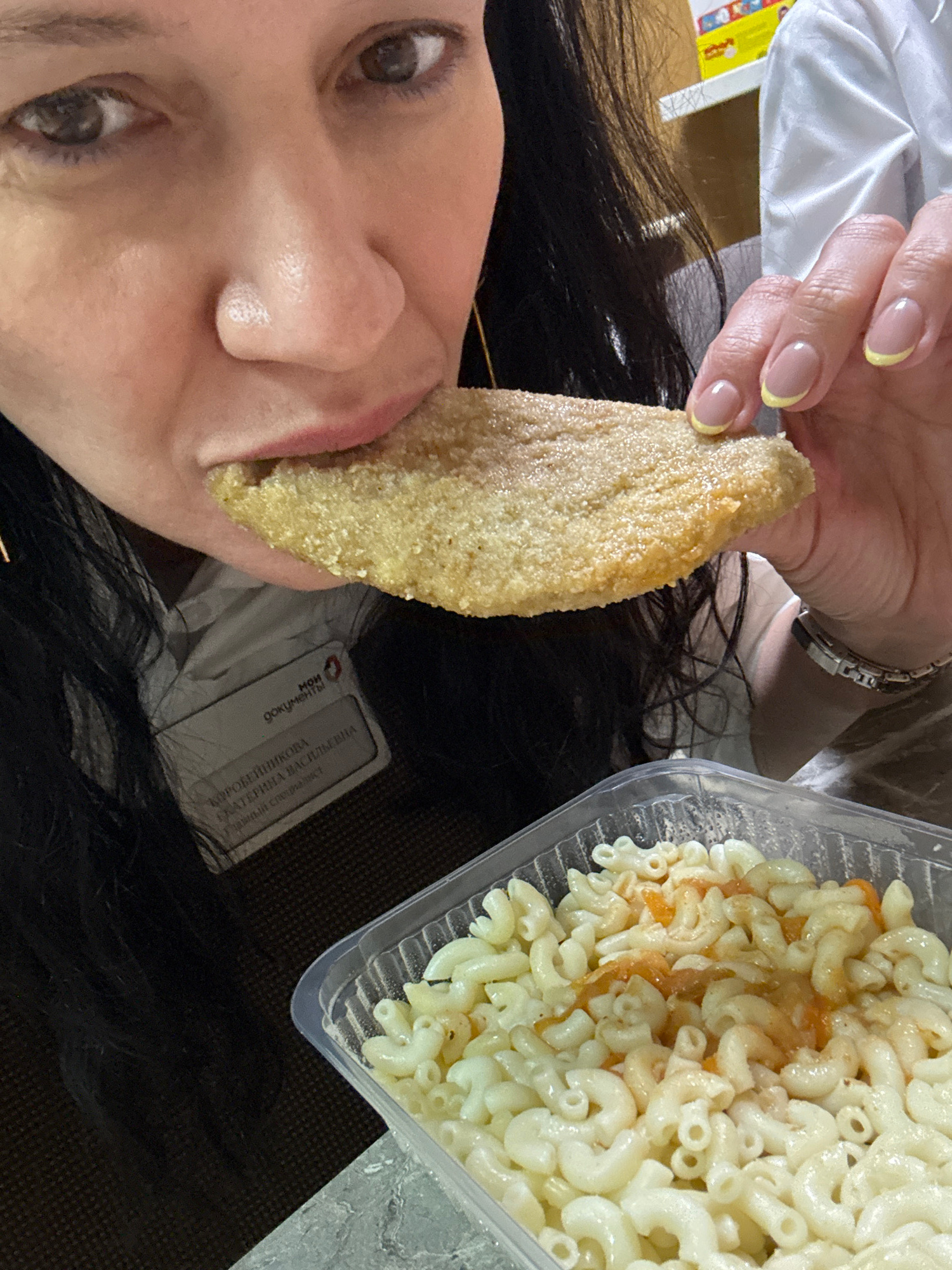 A person with dark hair and light skin holds a breaded food item near their mouth while posing for a photo. A plastic container of macaroni and cheese is visible beside them. The location is likely in Chaikovsky, Russia, as a document card with Cyrillic text and the word "Чайковский" is partially visible in the background. The person has manicured fingernails with a yellow accent. | Open Wire