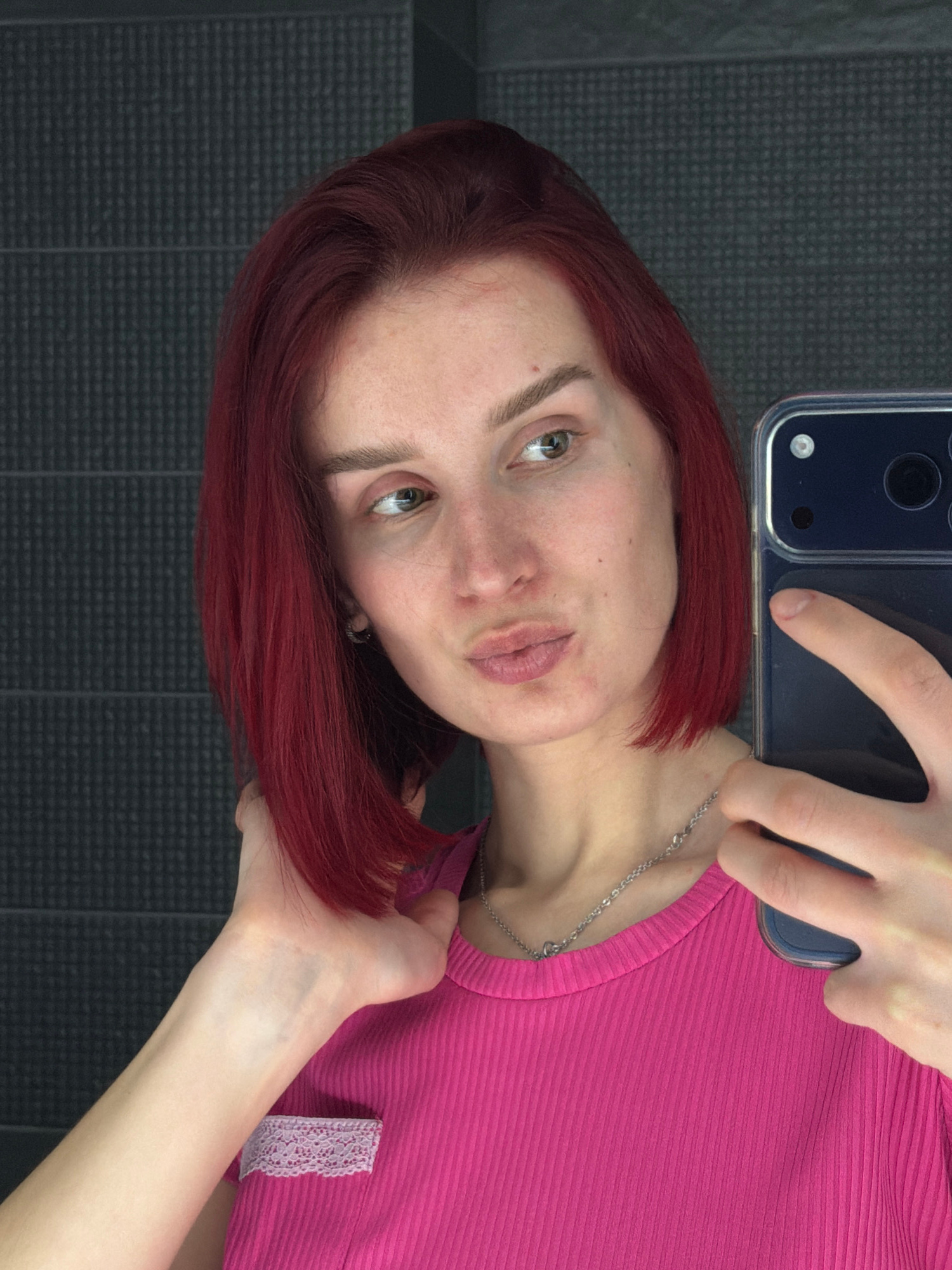 A young woman with red, shoulder-length hair is taking a selfie using her phone. She is wearing a pink shirt with a lace detail. The background appears to be a dark gray, tiled surface. The location i…read more