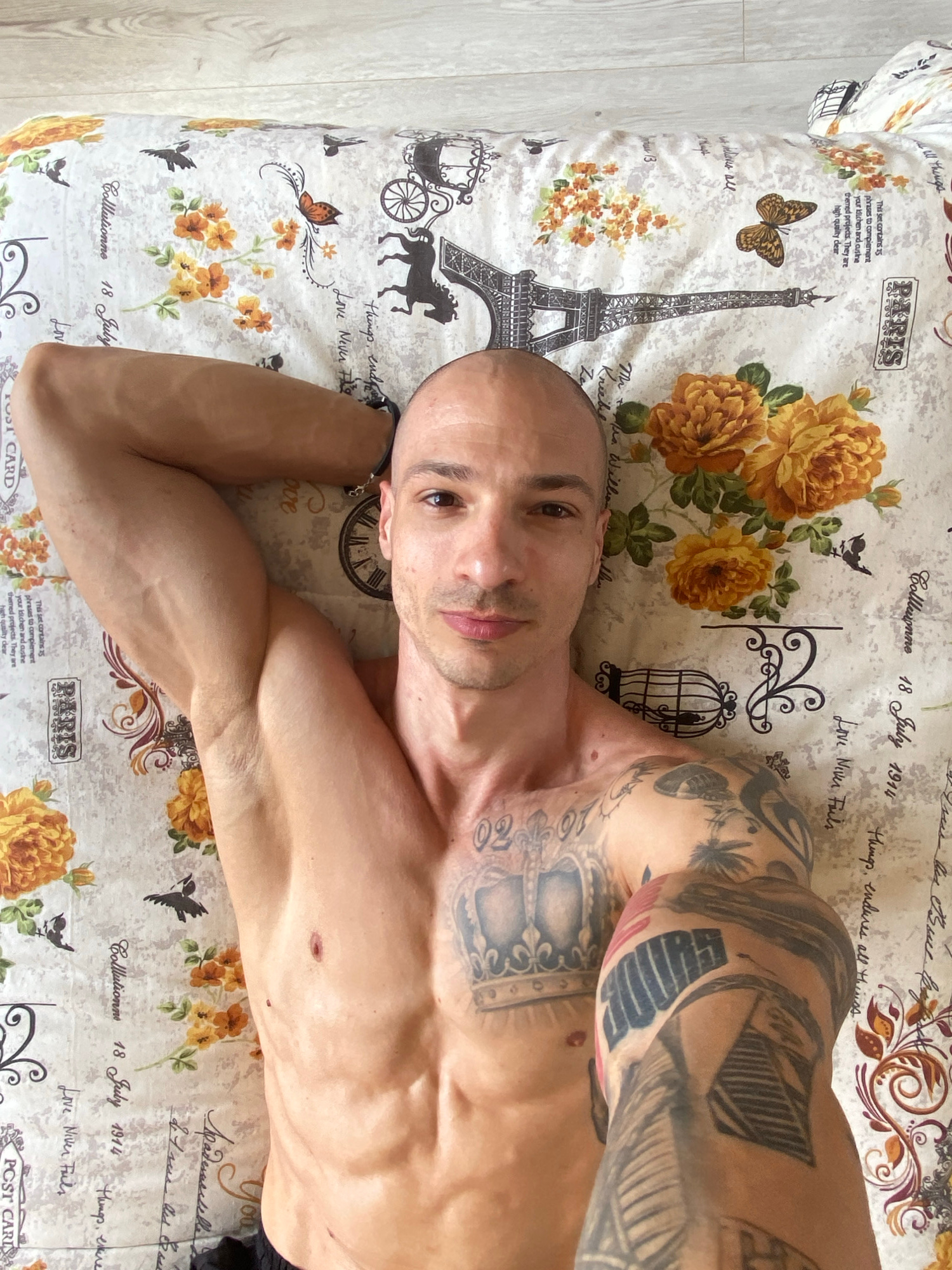 An adult male is pictured lying on his back on a bed, looking directly at the camera. He is shirtless, revealing a muscular physique and extensive dark tattoos covering both arms and his chest. On his…read more