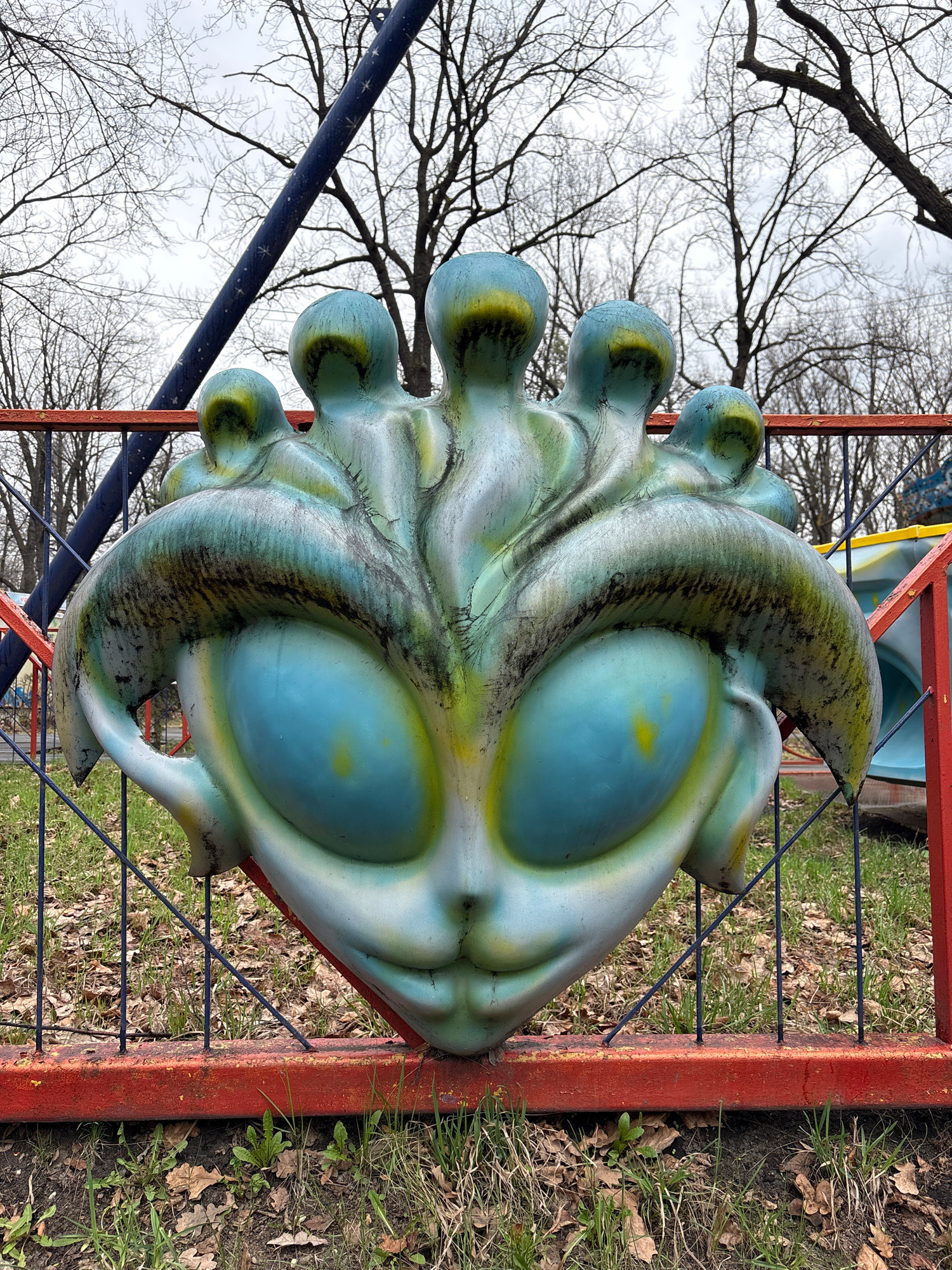A large, light blue and green, mask-like sculpture resembling a fantastical sea creature with oversized blue eyes is mounted on a red and blue metal frame outdoors. The sculpture is detailed with swir…read more