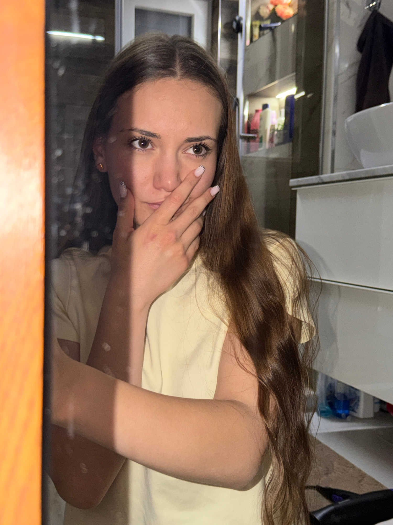 A young woman with brown hair and light skin is seen in a medium shot. She is wearing a yellow shirt. Her right hand is touching her face. The background includes a reflection of a room with various o…read more