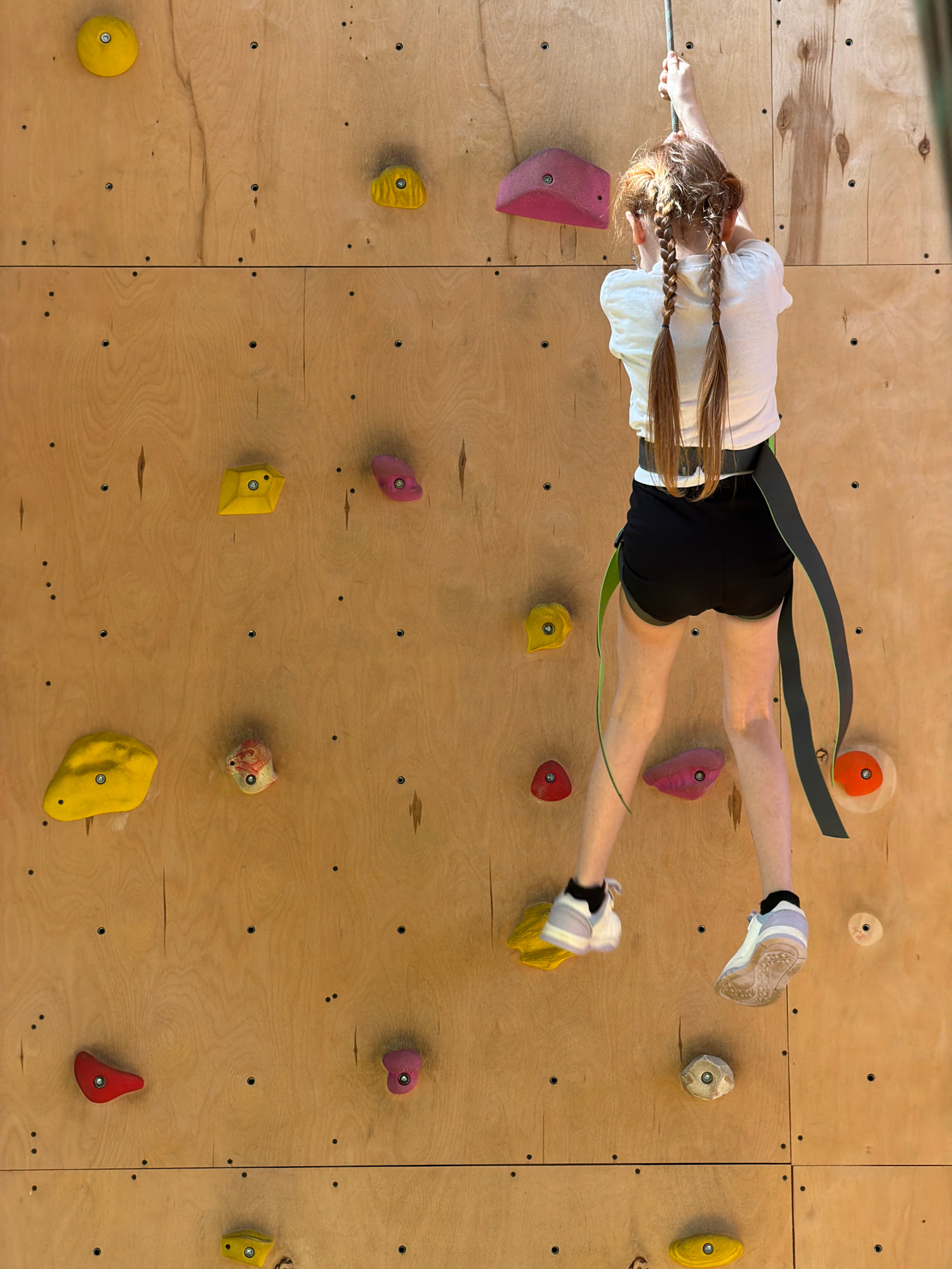 An overhead shot captures a person actively rock climbing on an indoor climbing wall in Izhevsk, Russia. The climber, a young individual with long, reddish-brown hair styled in two braids, is position…read more