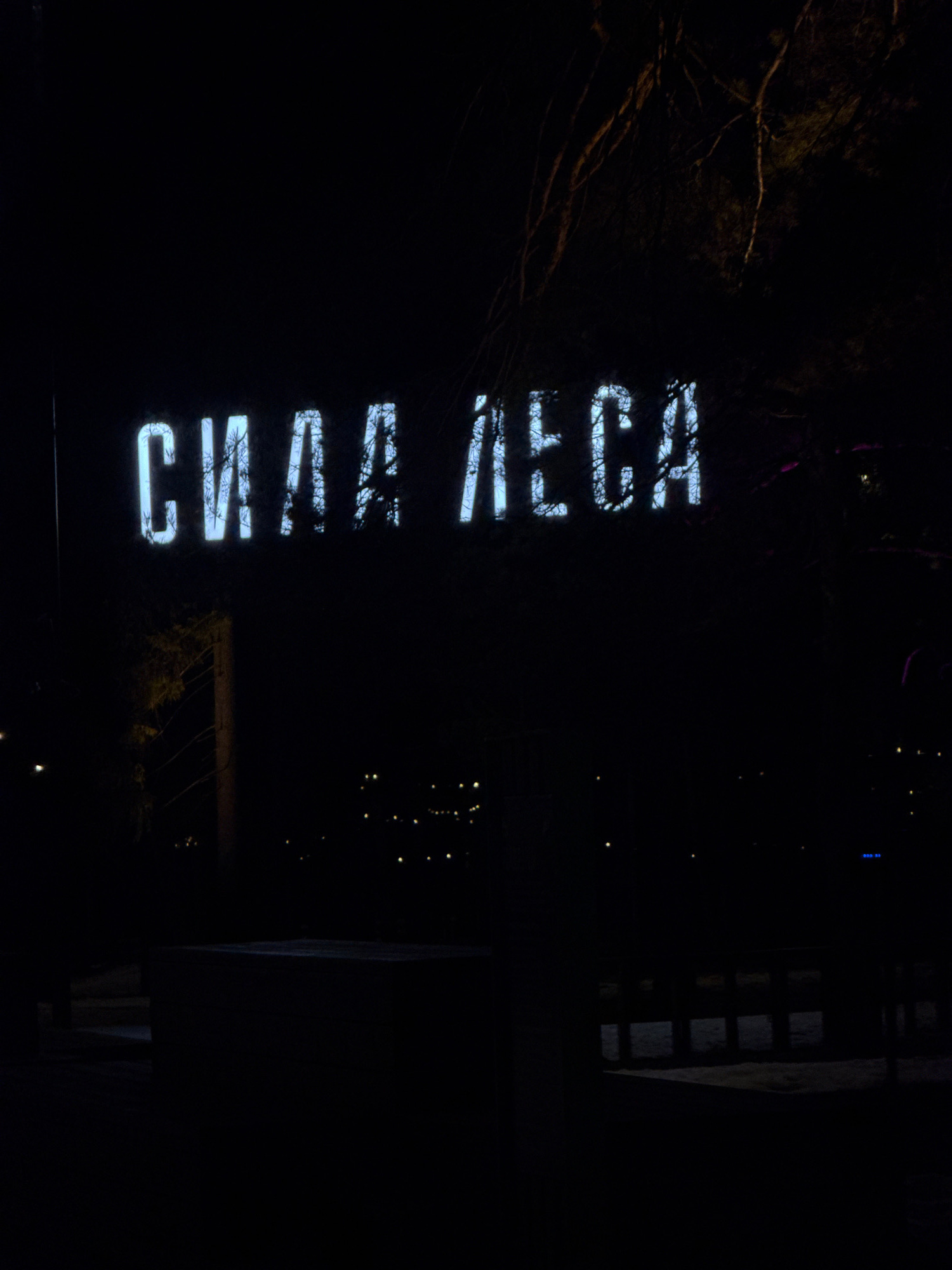 A nighttime image depicts the illuminated word "СУШАЯ ЛЕБЕДЬ" (Suschaya Lebed', or "Existing Swan") projected onto a structure in Votkinsk, Russia. The text appears bright white against the dark backg…read more