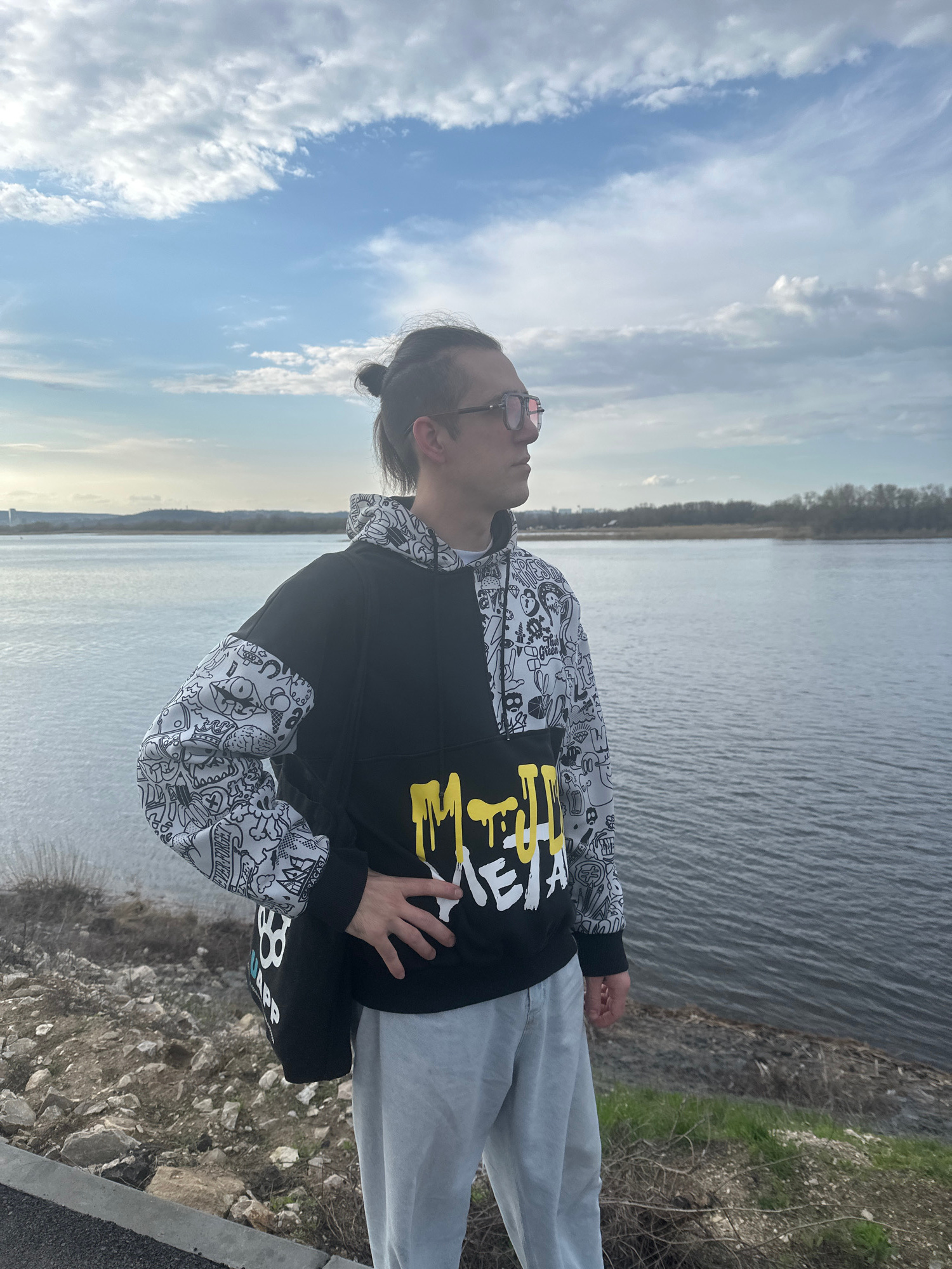 A person wearing sunglasses, a black hoodie with white sleeves, and gray pants stands near the Volga River in Engels, Russia. The person's head is tilted back, looking up at the sky, which is partly c…read more