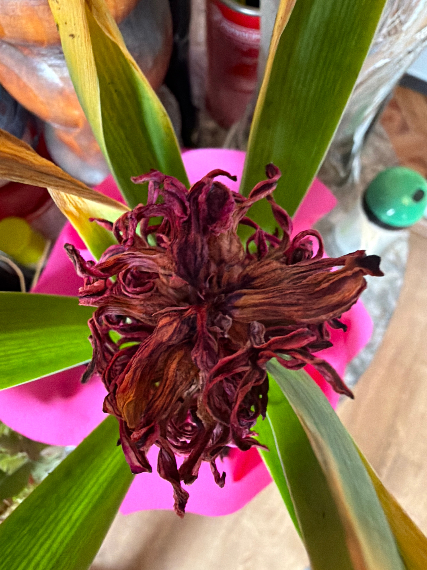 The image presents a close-up, overhead view of a wilted flower with dried, brown and burgundy petals. The flower is surrounded by long, green leaves. The flower is set in a bright pink vase. Other ob…read more