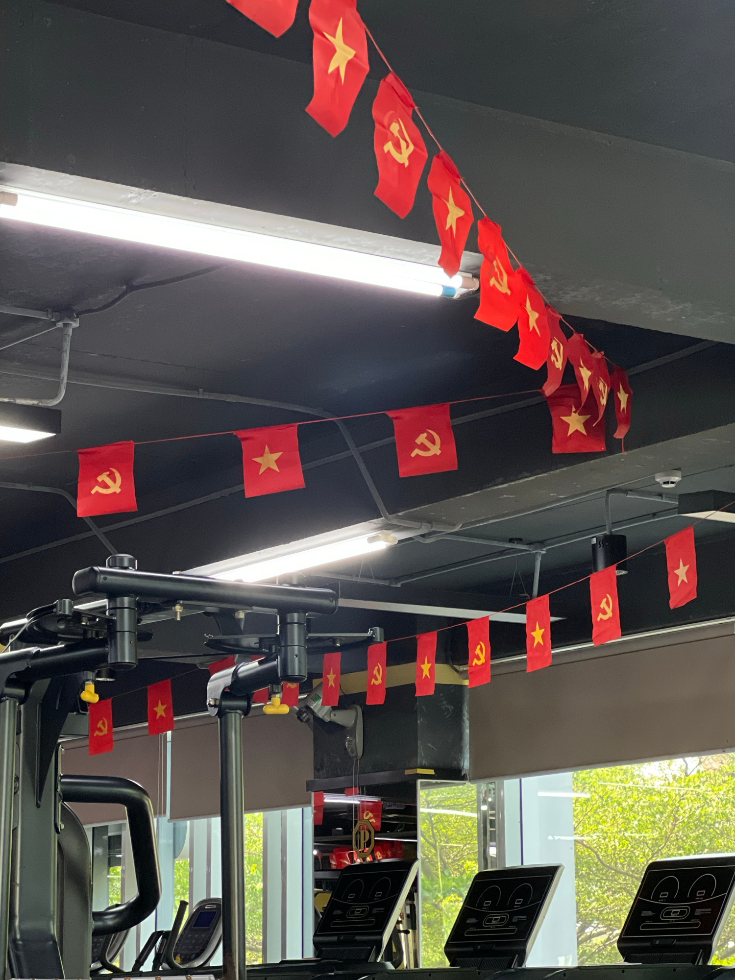 The image displays an indoor setting decorated with numerous small red flags strung across dark architectural beams and walls. The flags alternate between two designs: some feature a large yellow five…read more