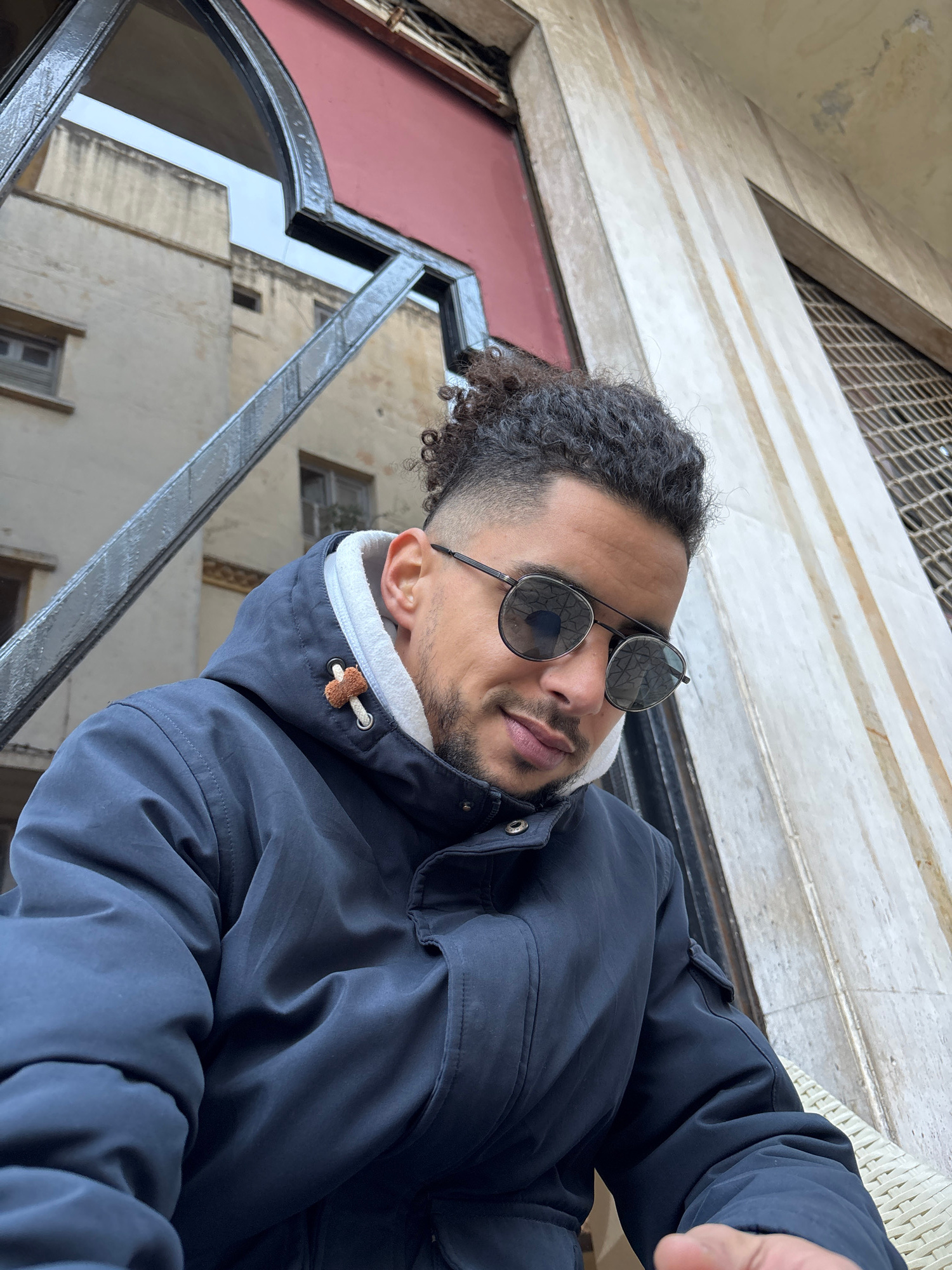 A man with dark curly hair, a beard, and sunglasses is pictured from a low angle in what appears to be Tanger, Morocco. He is wearing a dark blue jacket with a white-hooded liner. The background shows…read more