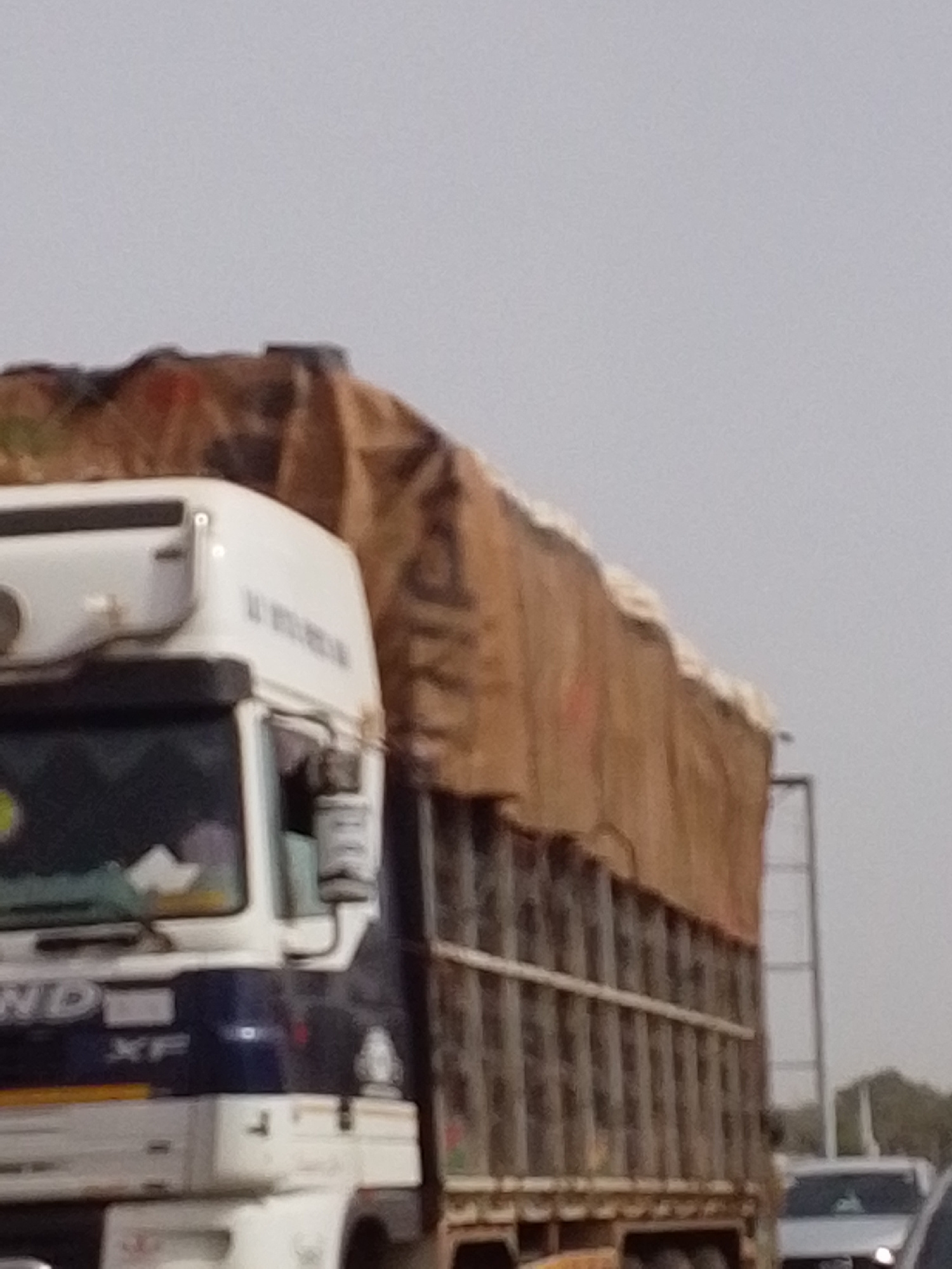 The image depicts the upper portion of a large, heavily laden truck. The truck's cab is white and dark blue. The truck is covered with a brown canvas tarp. The truck appears to be on a road, with othe…read more