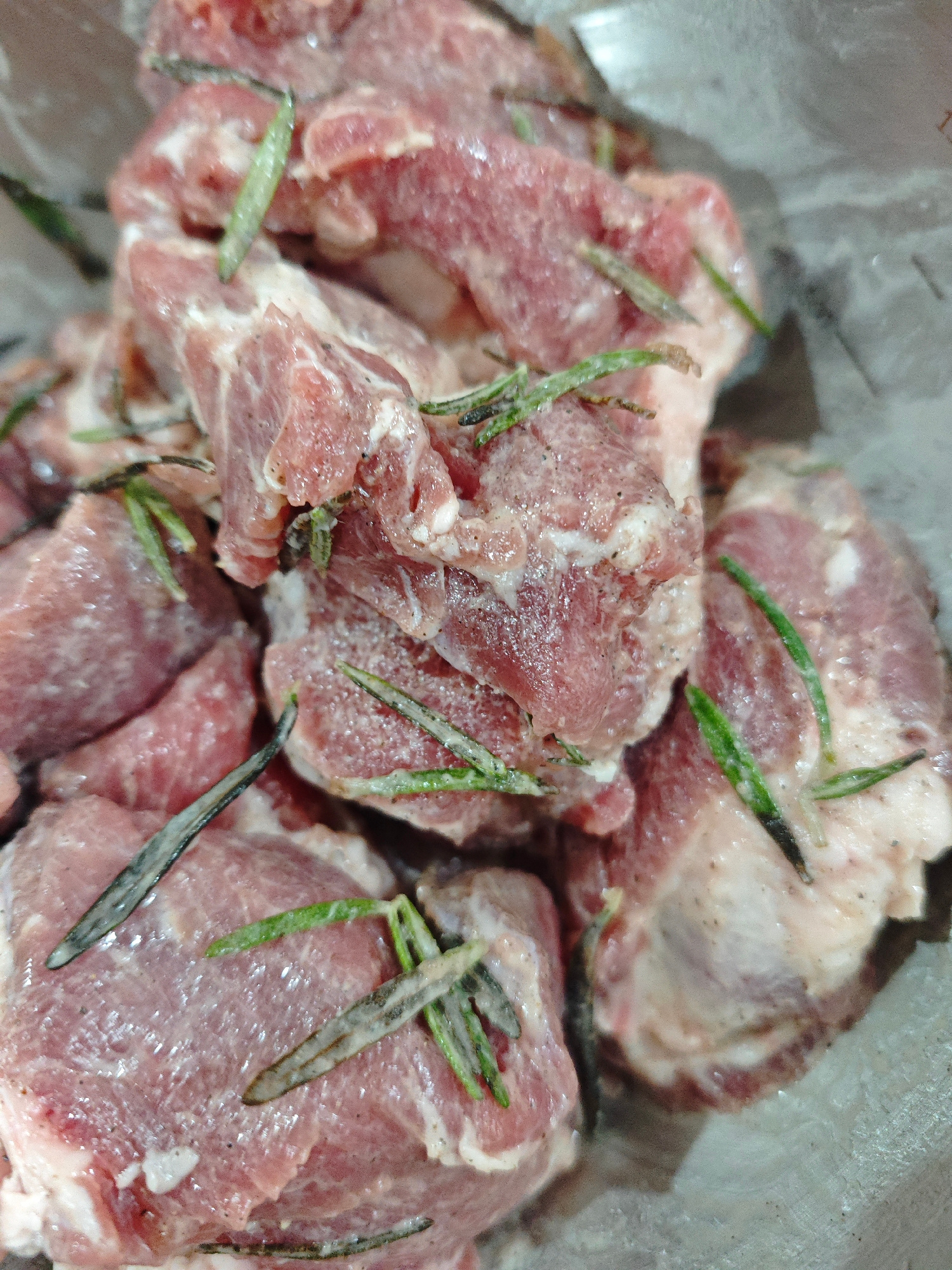 The image shows raw, cubed pieces of meat, possibly pork or lamb, seasoned with what appears to be fresh rosemary. The meat is pink with visible fat marbling. The scene is a close-up, likely in a dome…read more