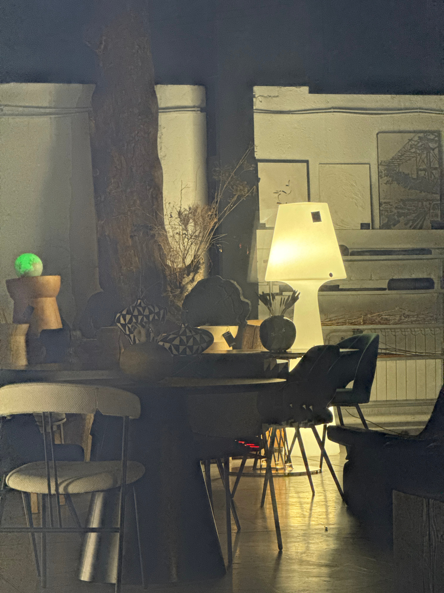 The image shows a nighttime interior scene with eclectic decor. The setting appears to be Krasnoyarsk, Russia, given the context. Dominating the scene are several pieces of modern art or design. A bri…read more