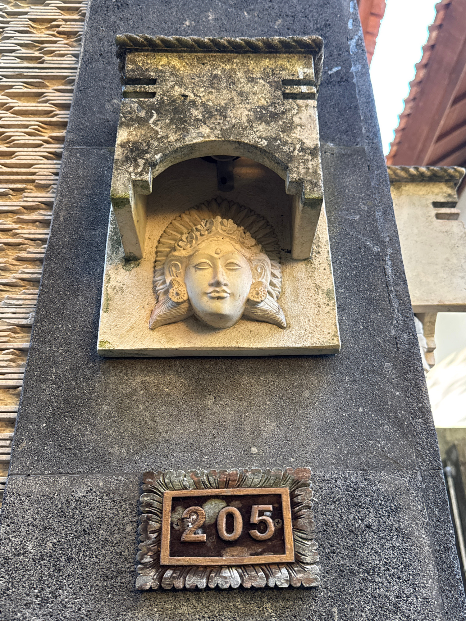 A close-up shot shows a gray stone wall in Ungasan, Indonesia. Affixed to the wall is a rectangular beige stone sculpture of a face surrounded by a textured semicircle within an open stone frame, which forms an arch over the face. To the right of the sculpture is a small, ornate wooden plaque displaying the number "205." The bottom of the wall has a vertical beige pattern, while the roof structure is visible in the background. | Open Wire