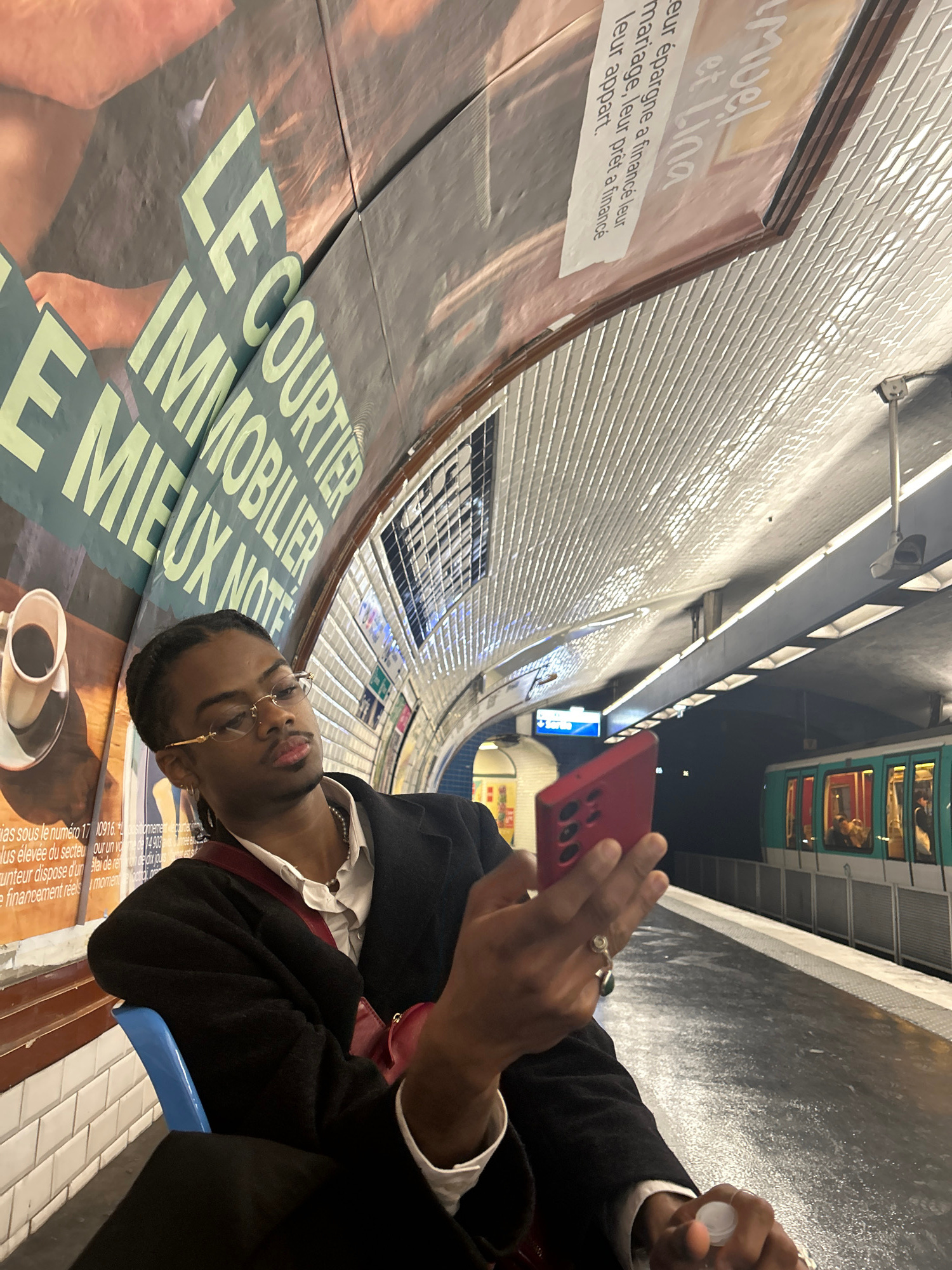 The image shows a man sitting on a blue plastic seat in what appears to be a Paris Metro station, based on the distinctive white tiled curved walls and the presence of a Metro train visible above. The…read more