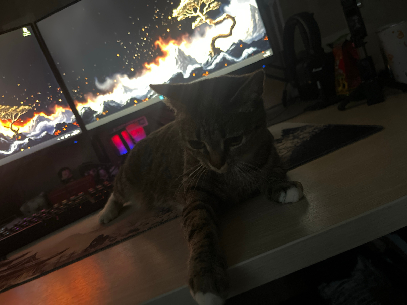 A medium-sized, brown tabby cat is resting on a desk. The cat is positioned between two computer monitors, displaying a desktop background with a tree and fiery sky. In the background, headphones areβ¦read more