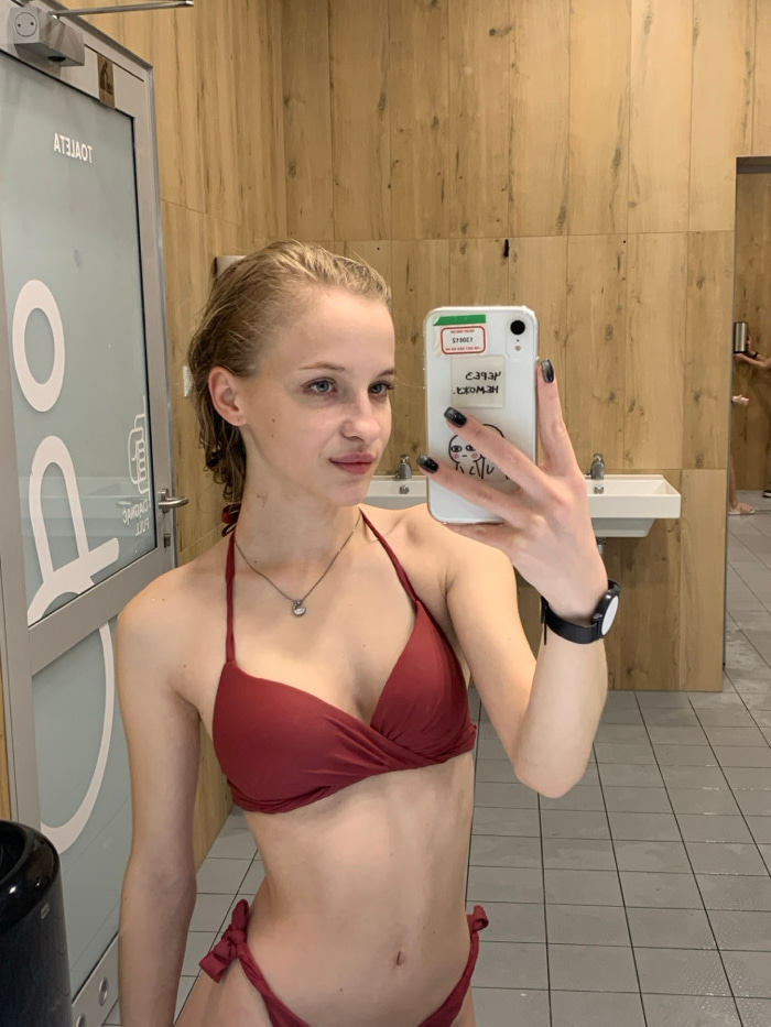 A slender woman in a burgundy bikini poses for a selfie in what appears to be a locker room. She holds her phone, decorated with stickers, in her left hand, showcasing black painted nails. The backgro…read more