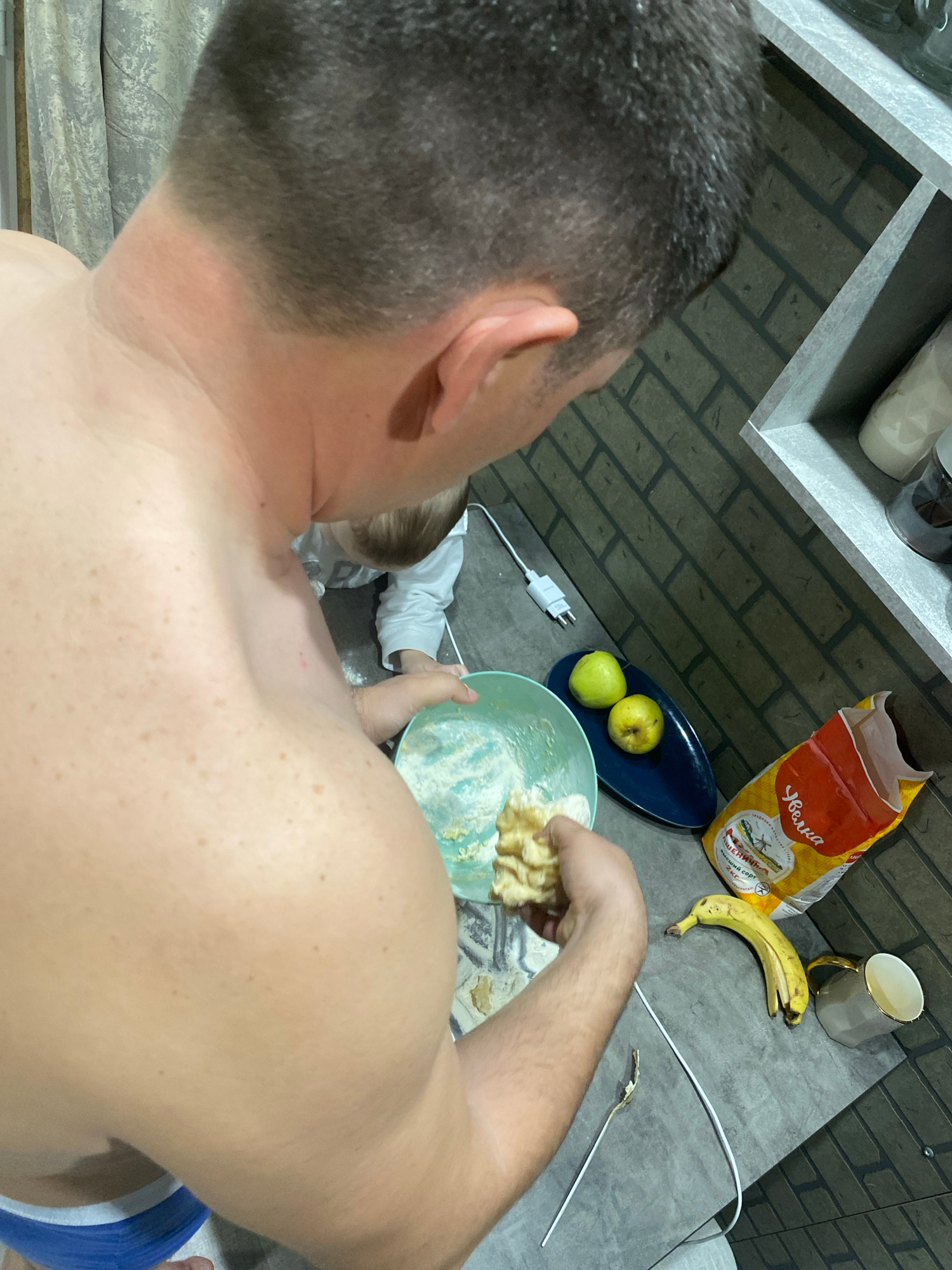 A shirtless man is mixing ingredients in a bowl on a kitchen counter, while a child wearing a long-sleeved white shirt stands nearby. The counter also holds a bag of flour labeled "Увелка", two green…read more