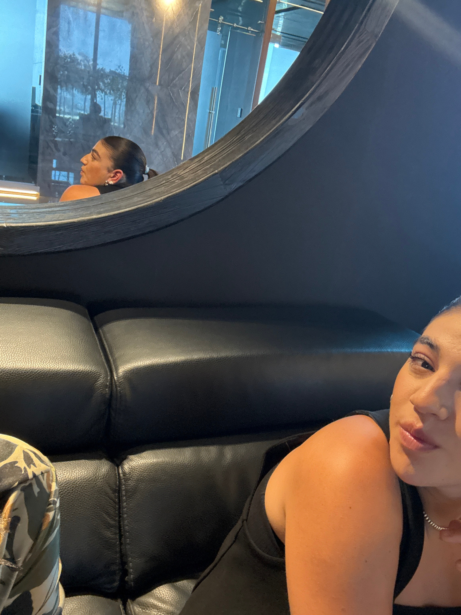 A woman is sitting on a black leather couch. In a curved window, a reflection of the same woman, possibly in the same place, is visible. The location is suggested to be San Bernardino Tlaxcalancingo,…read more