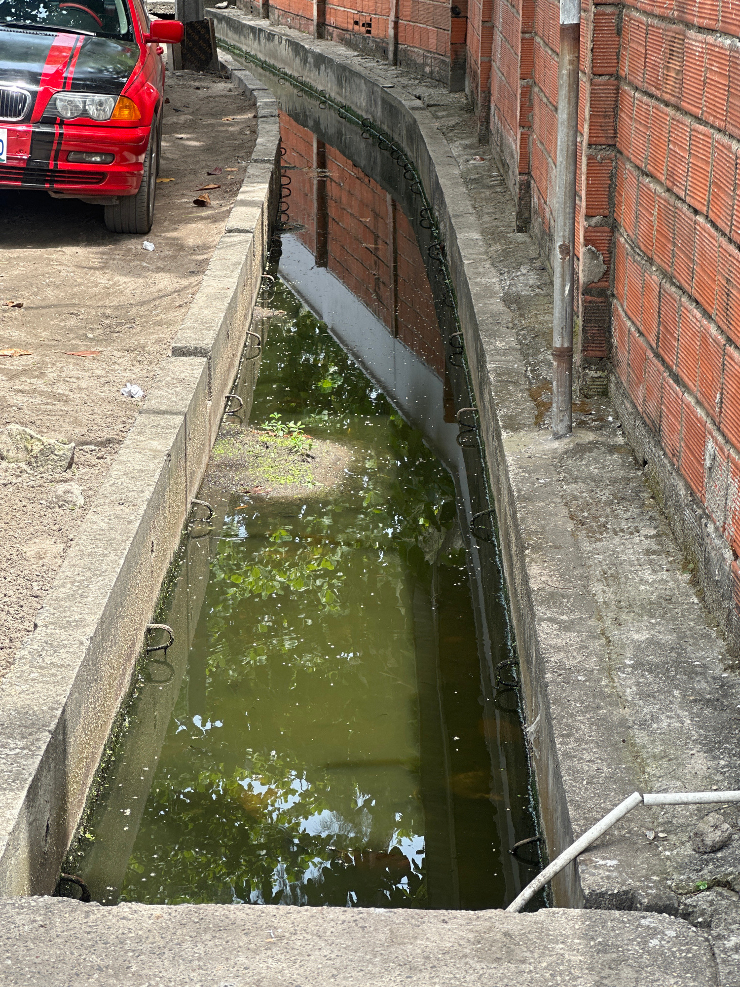 The image depicts a concrete drainage canal filled with green water, reflecting trees. Above the canal is a brick archway. A red van is partially visible on the left side of the frame. The image is ro…read more