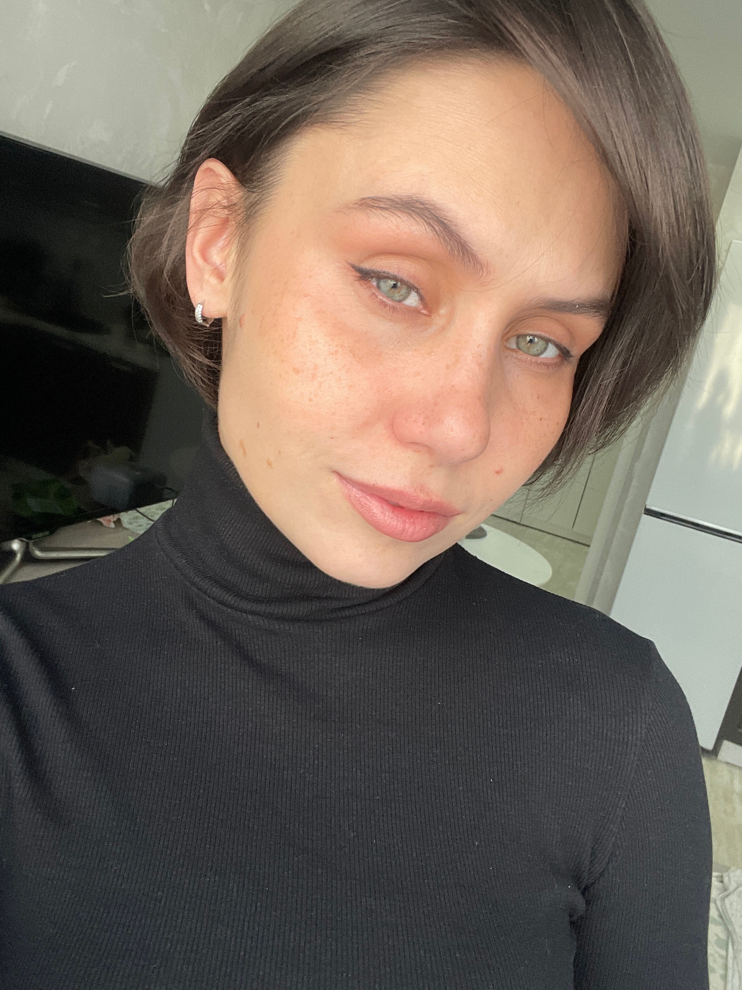 A close-up, angled portrait features a young woman with short, dark brown hair, looking slightly to her right. She has fair skin with numerous freckles across her nose and cheeks, and striking light g…read more