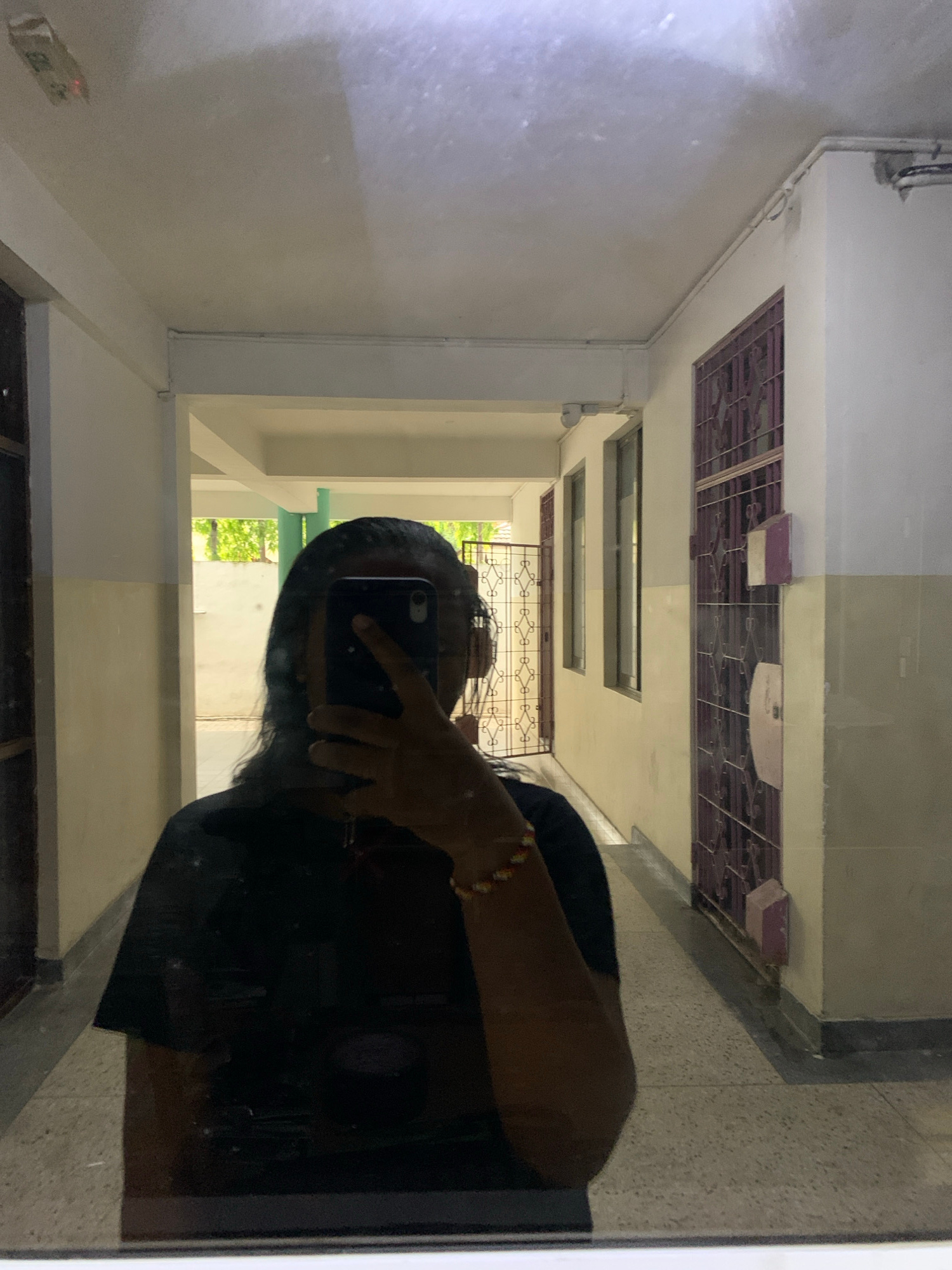 A person is taking a mirror selfie inside a building. The reflection shows a hallway with multiple windows, which appear to be overlooking greenery outside, and a metal latticework at the end. The hal…read more