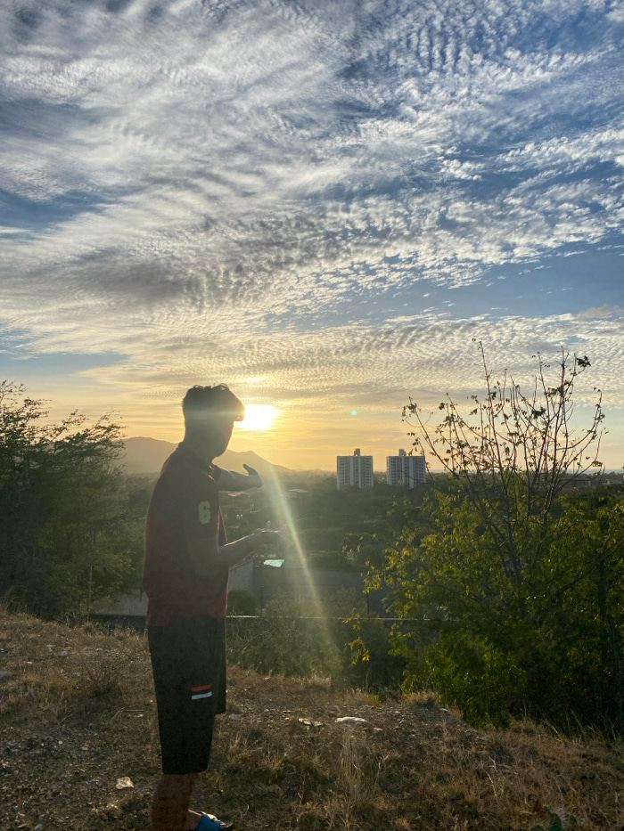 The image depicts a male subject positioned on an elevated, dry terrain overlooking the city of Juan Griego, Venezuela, during golden hour. The subject is oriented in profile, facing left, wearing a d…read more