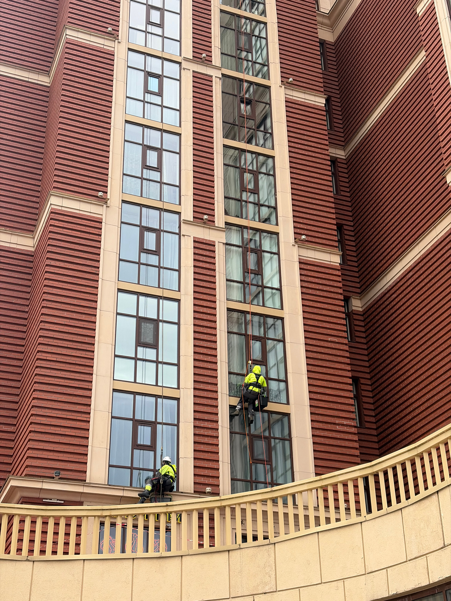 The image depicts two window washers cleaning the facade of a building in Saint Petersburg, Russia. The building has a distinctive architectural style with red vertical cladding and rows of windows. T…read more