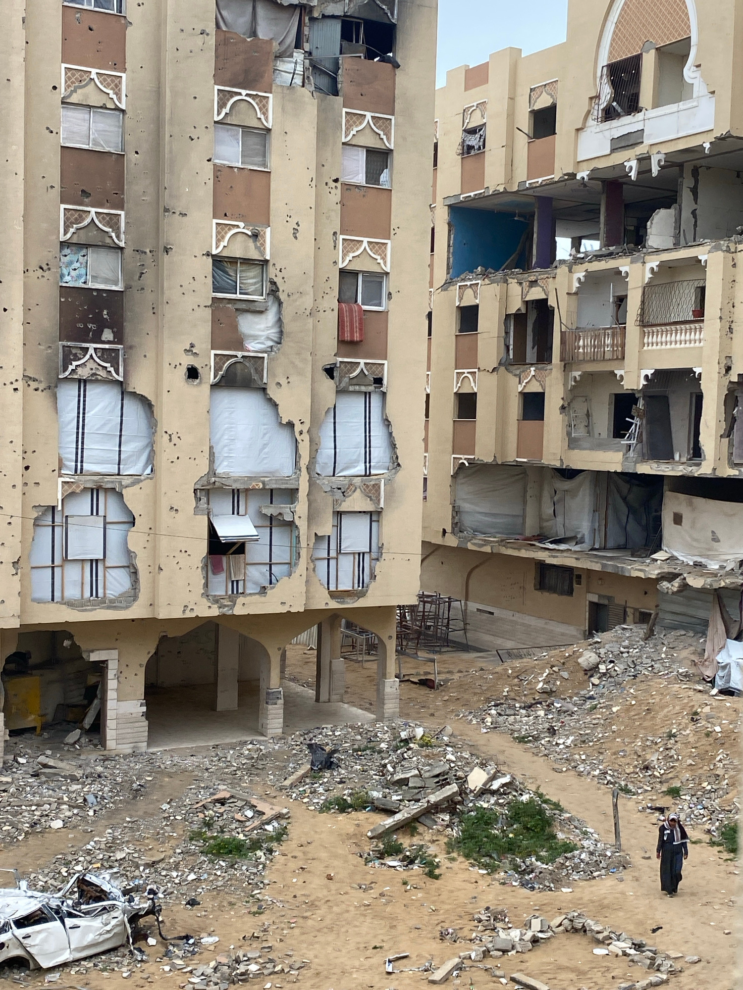 The image shows severe destruction of a multi-story building in Khan Yunis, Palestinian Territory. The building has large sections missing, likely due to bombing or shelling. The facade is heavily dam…read more